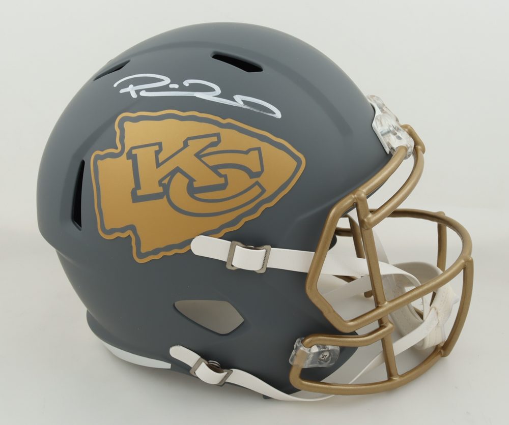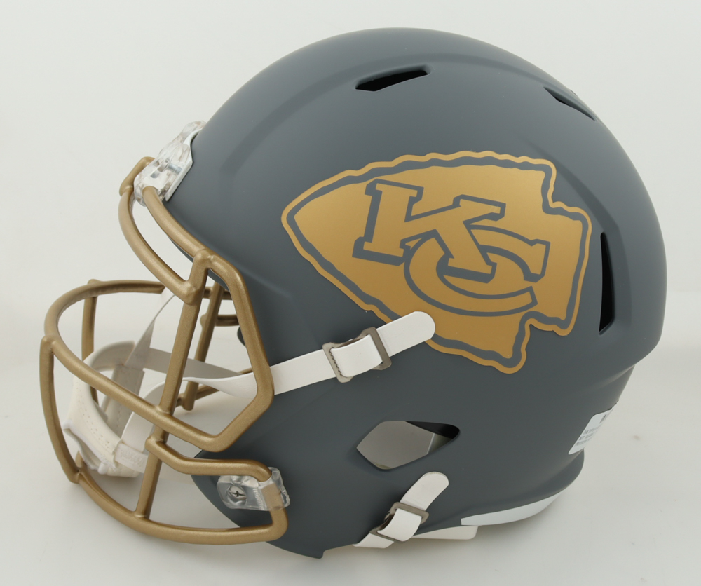 Riddell Kansas City Chiefs full-size slate alternate speed replica helmet. Hand-signed by Patrick Mahomes.