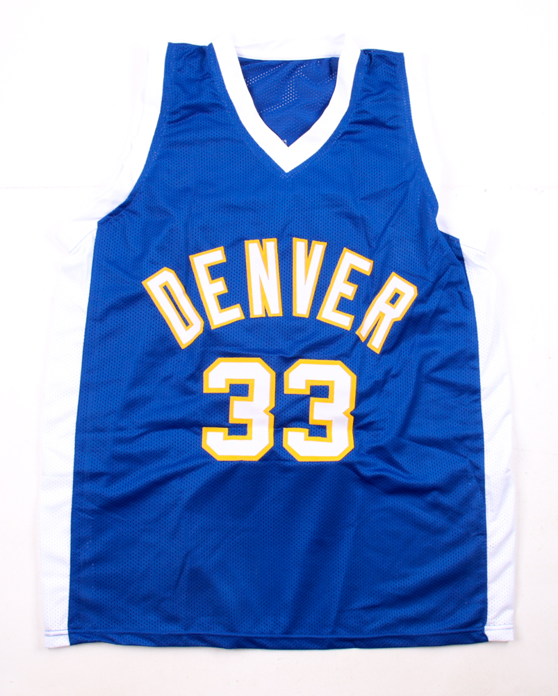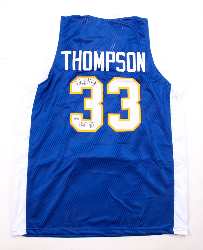 Custom jersey with everything sewn on, size XL. Hand-signed and inscribed by David Thompson (HOF).