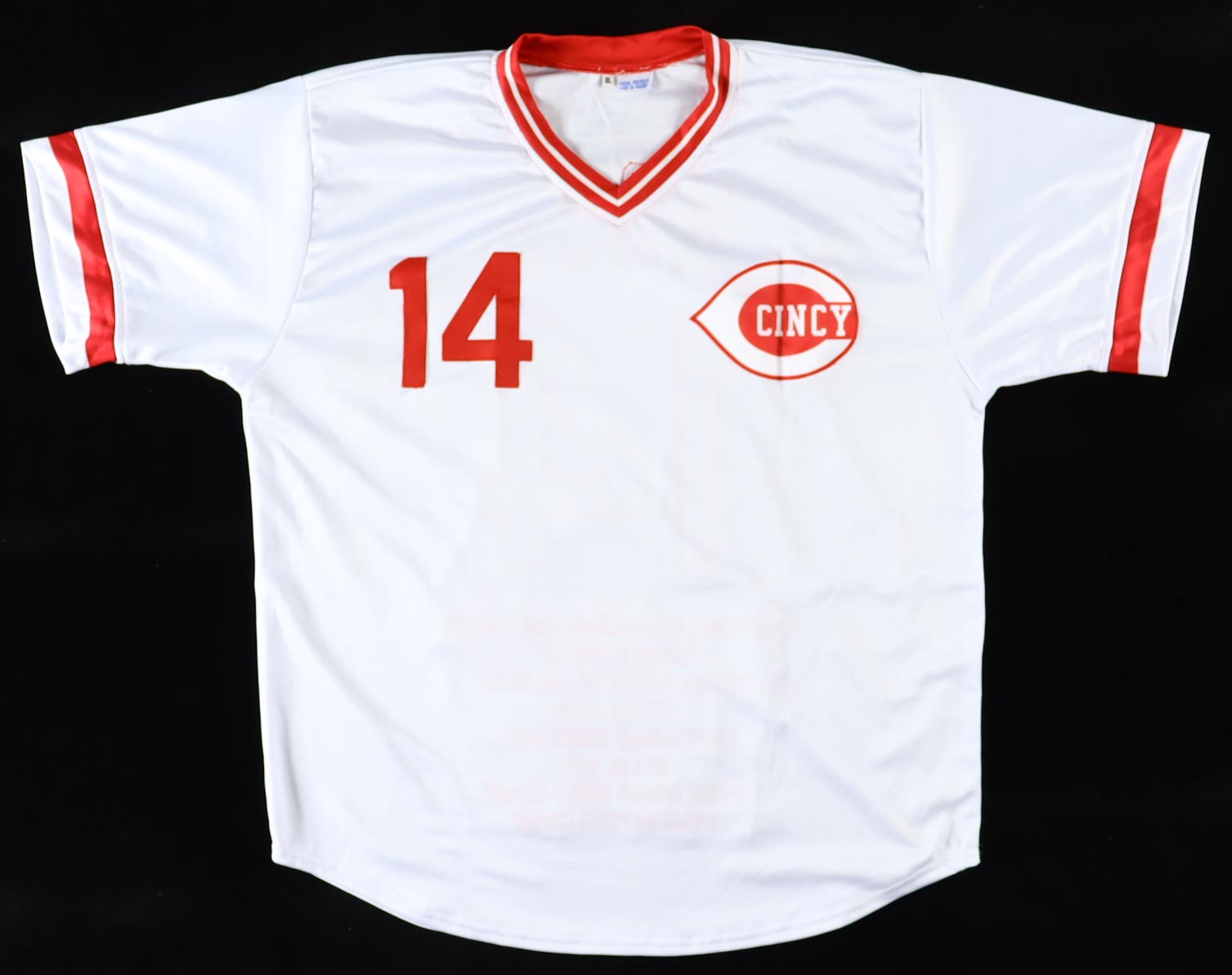 Custom jersey. Everything is sewn on, size XL. Hand-signed and inscribed by Pete Rose. Rose's career highlights have been custom stitched onto the back of the jersey below the reverse numbers.