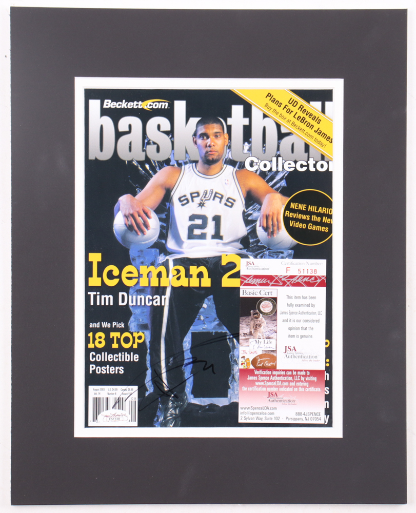 Custom matted display measures 12" x 15" in size and features a magazine cover photo that has been hand-signed by Tim Duncan (San Antonio Spurs, HOF).