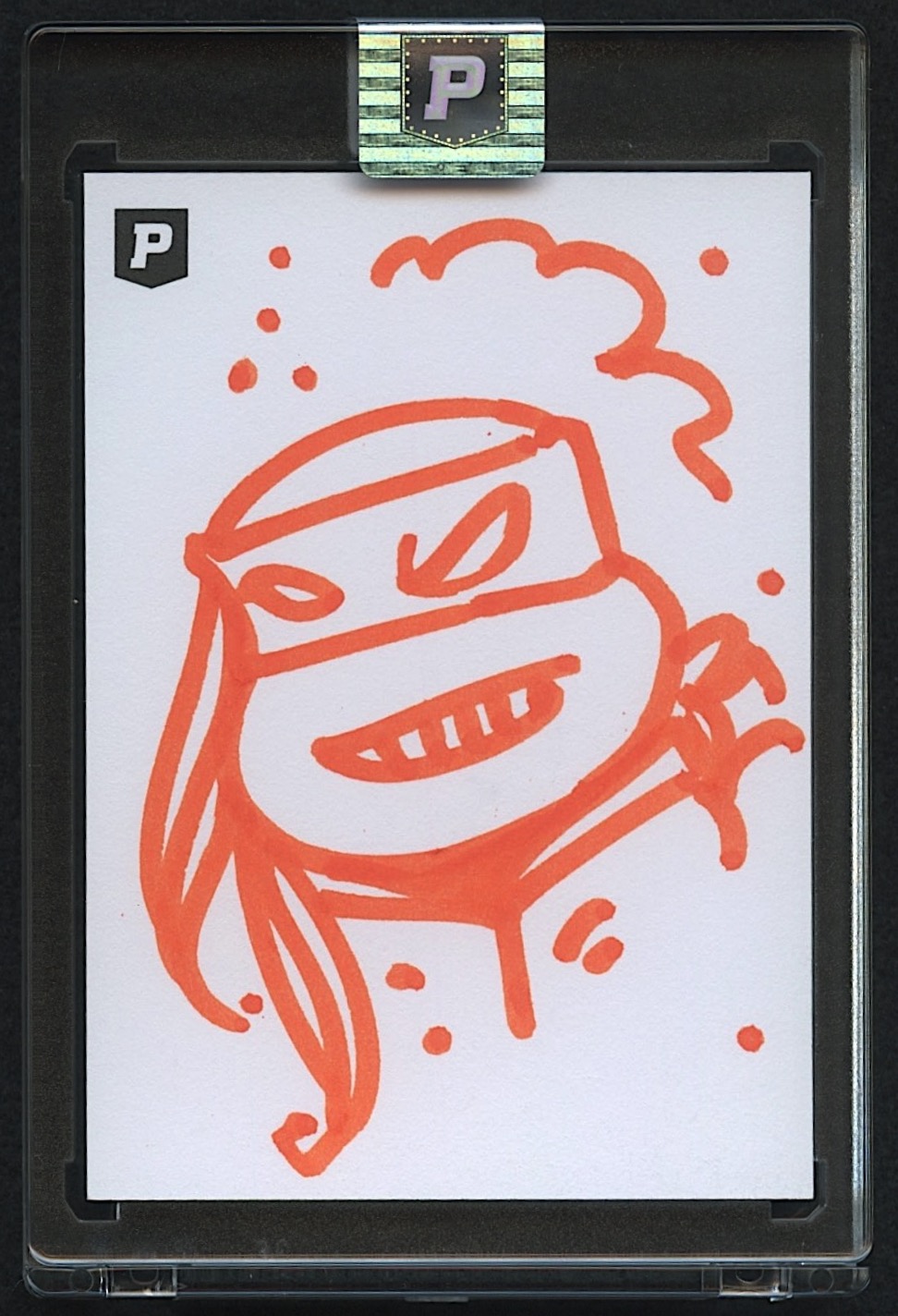 This sketch card includes original art by the co-creator of the Teenage Mutant Ninja Turtles, Kevin Eastman. The card is hand-signed on the back by Eastman.