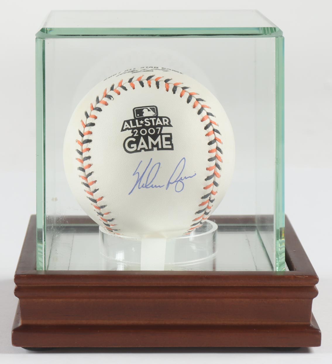 Rawlings Official 2007 All-Star logo baseball. Hand-signed by Nolan Ryan (Texas Rangers, HOF). The display case with wood base is included as shown.