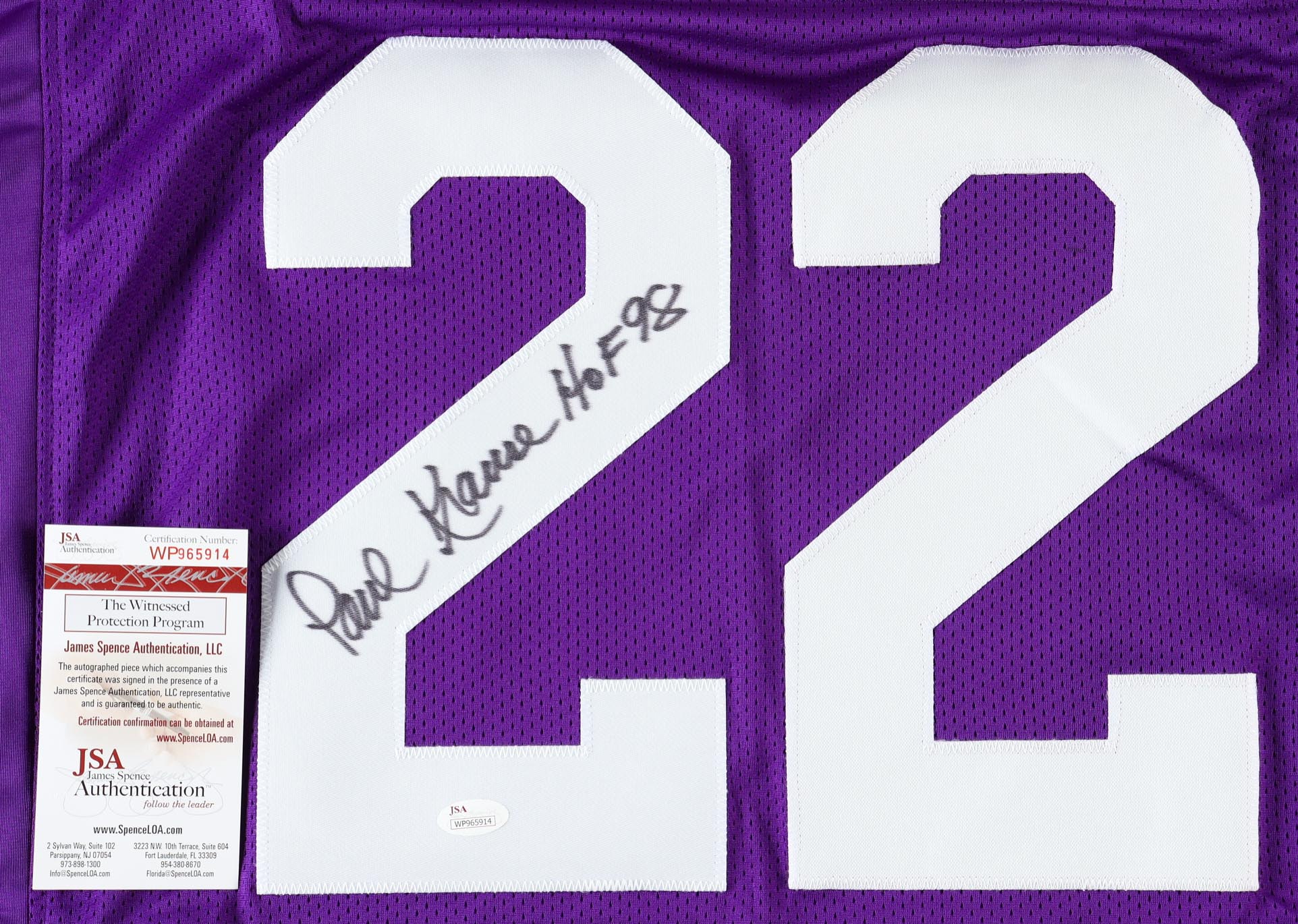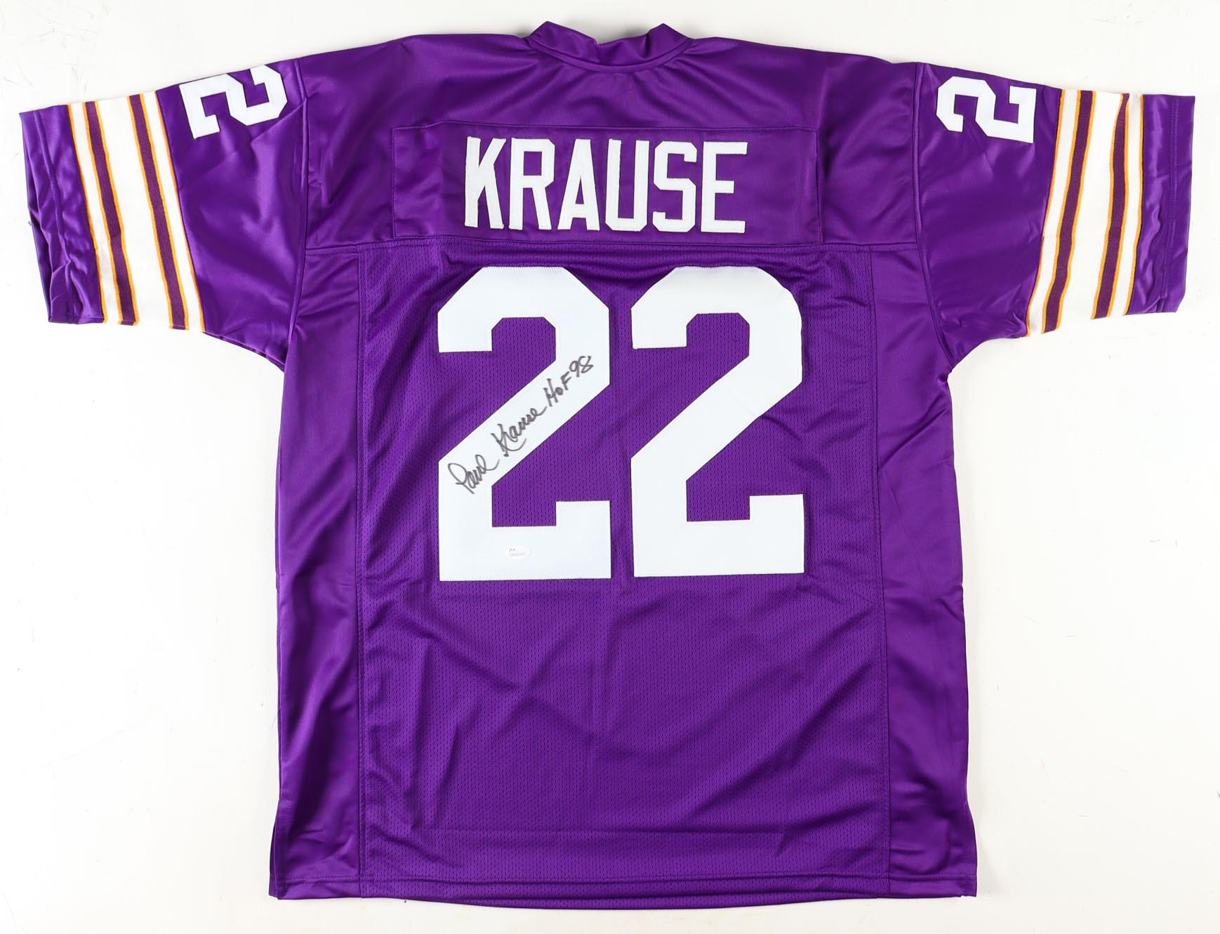 Custom jersey. Everything is sewn on, size XL. Has been hand-signed and inscribed by Paul Krause (HOF).