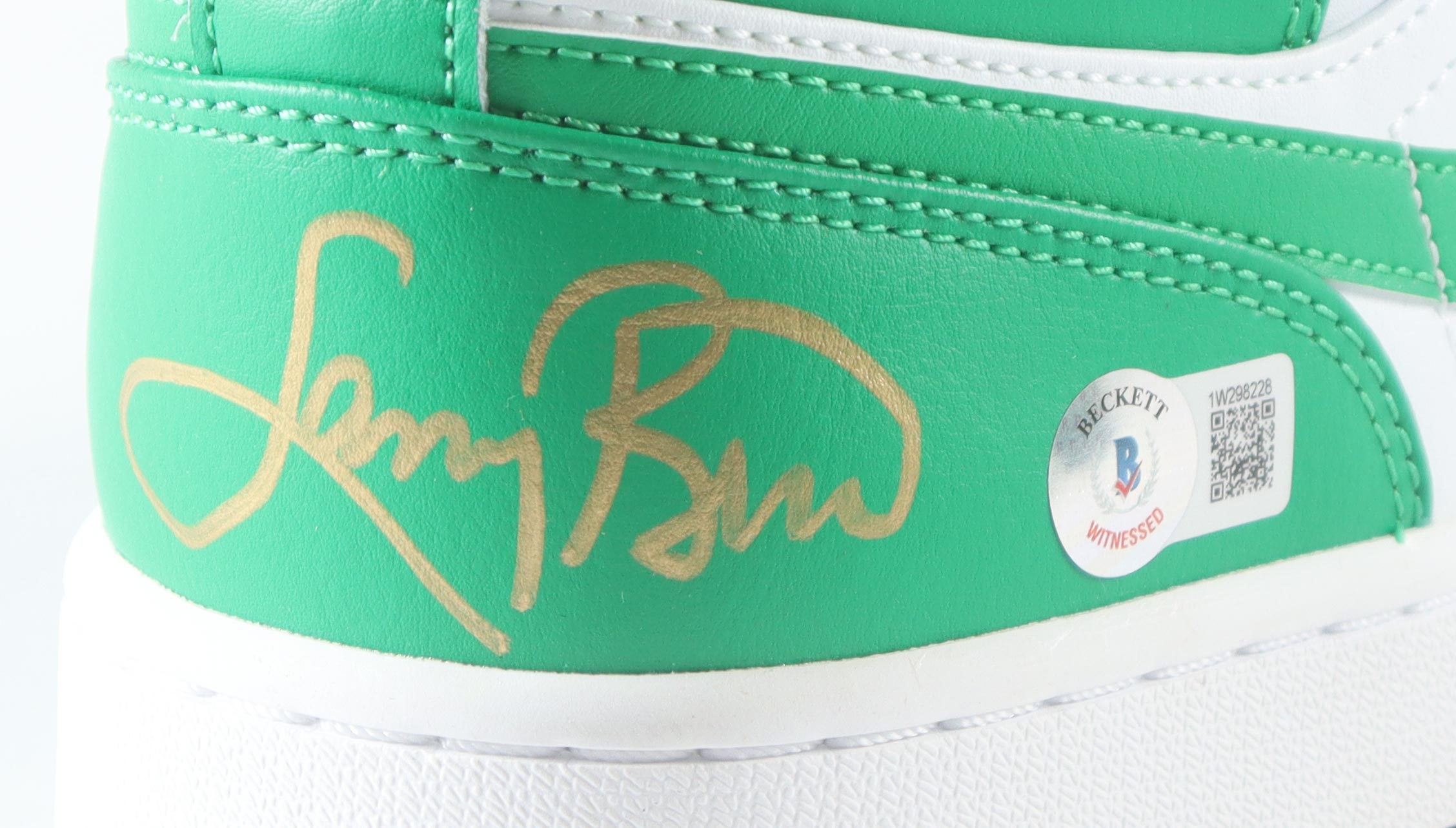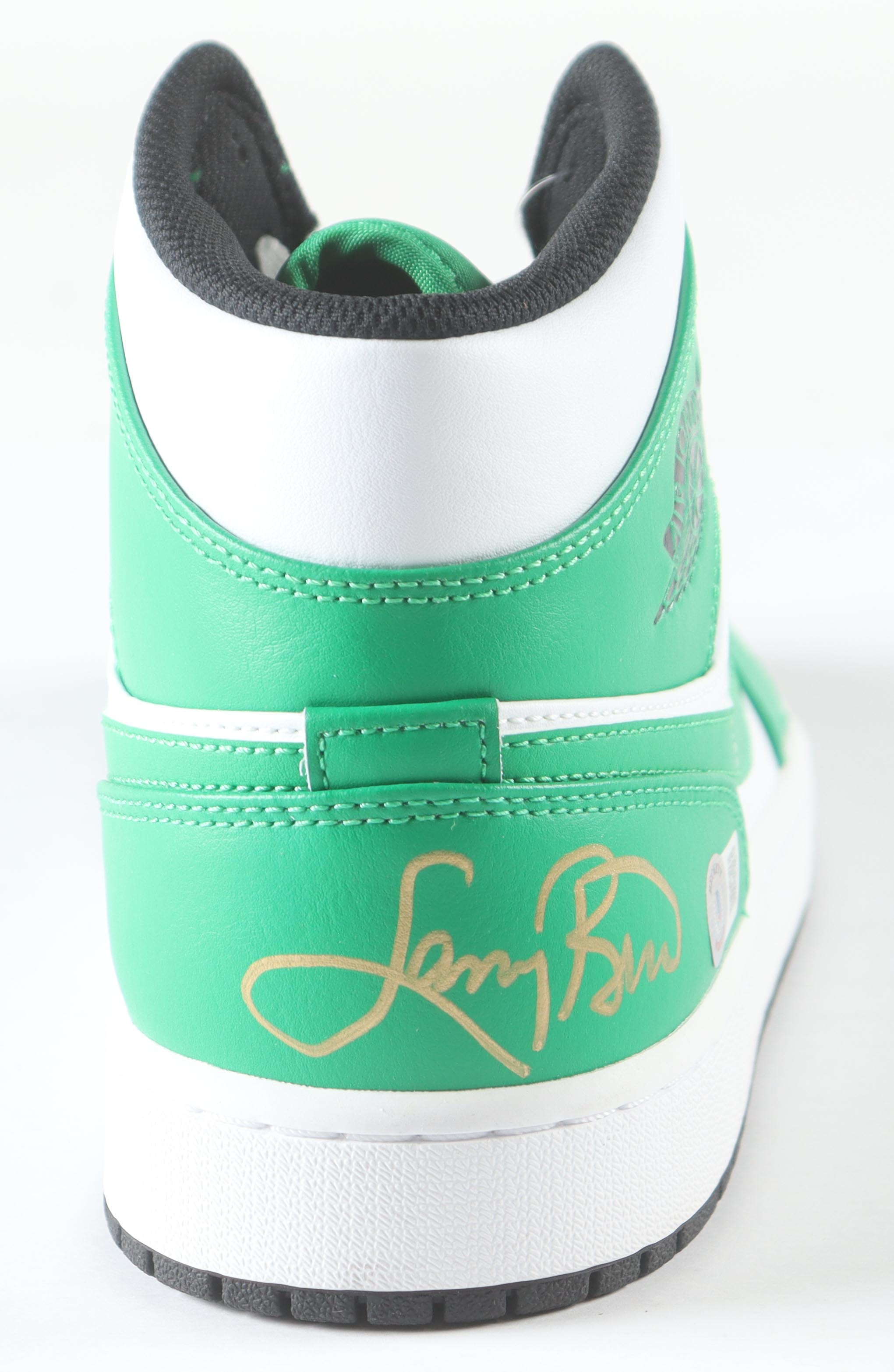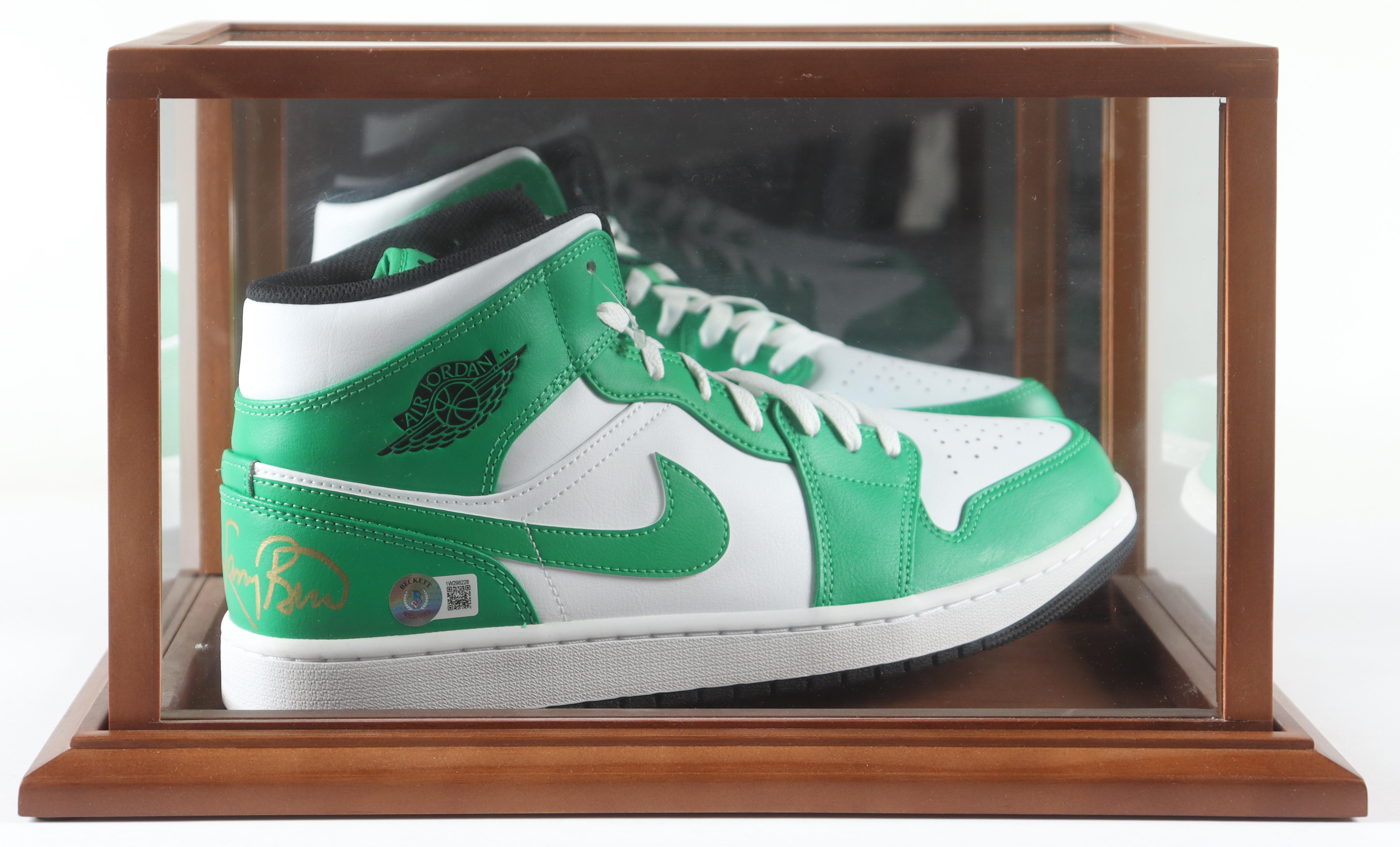 Nike Air Jordan basketball shoe, size 12. Hand-signed by Larry Bird (Boston Celtics, HOF). Display case is included as shown.
