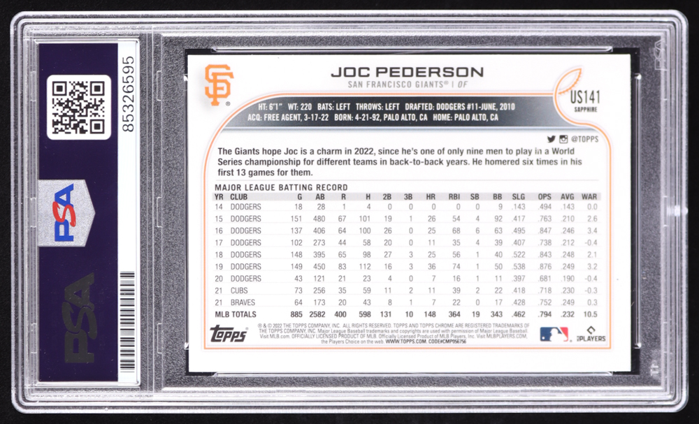 Joc Pederson Signed 2022 Topps Update Chrome Sapphire #US141 (PSA)