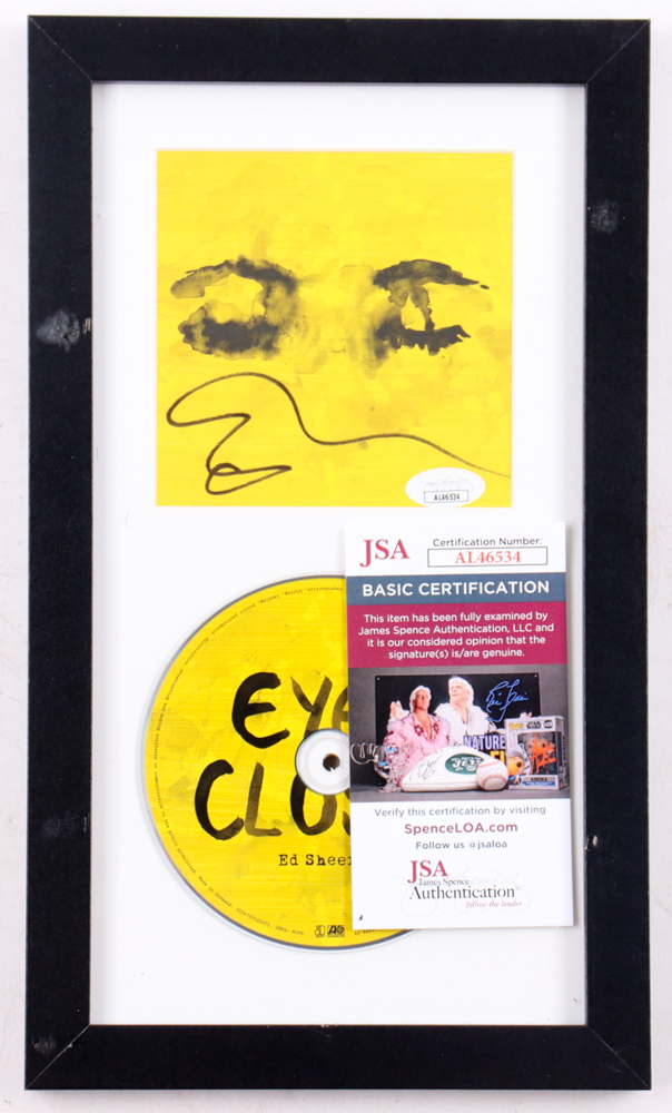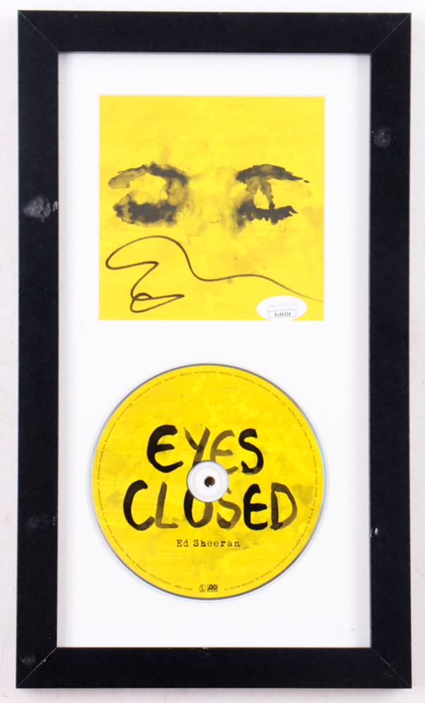 Custom frame measures approximately 8" x 13.5" in size. Features a "Eyes Closed" CD album insert that has been hand-signed by Ed Sheeran. The disc is included as shown. Please note framing is damaged, see photos for more details.