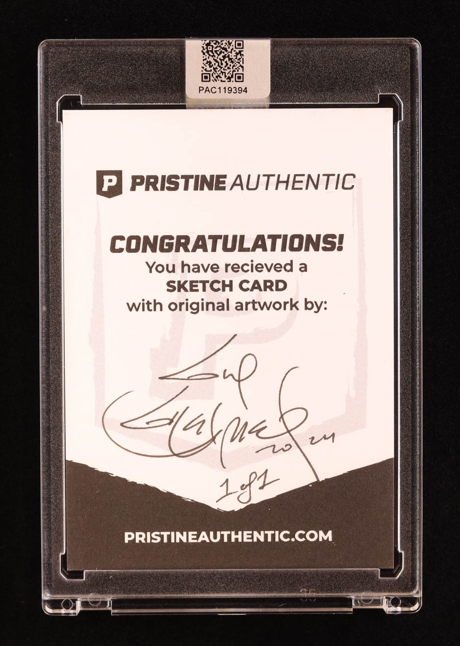 This sketch card includes original art by world-renowned illustrator, Guy Gilchrist. The card is hand-signed on the back by Gilchrist.