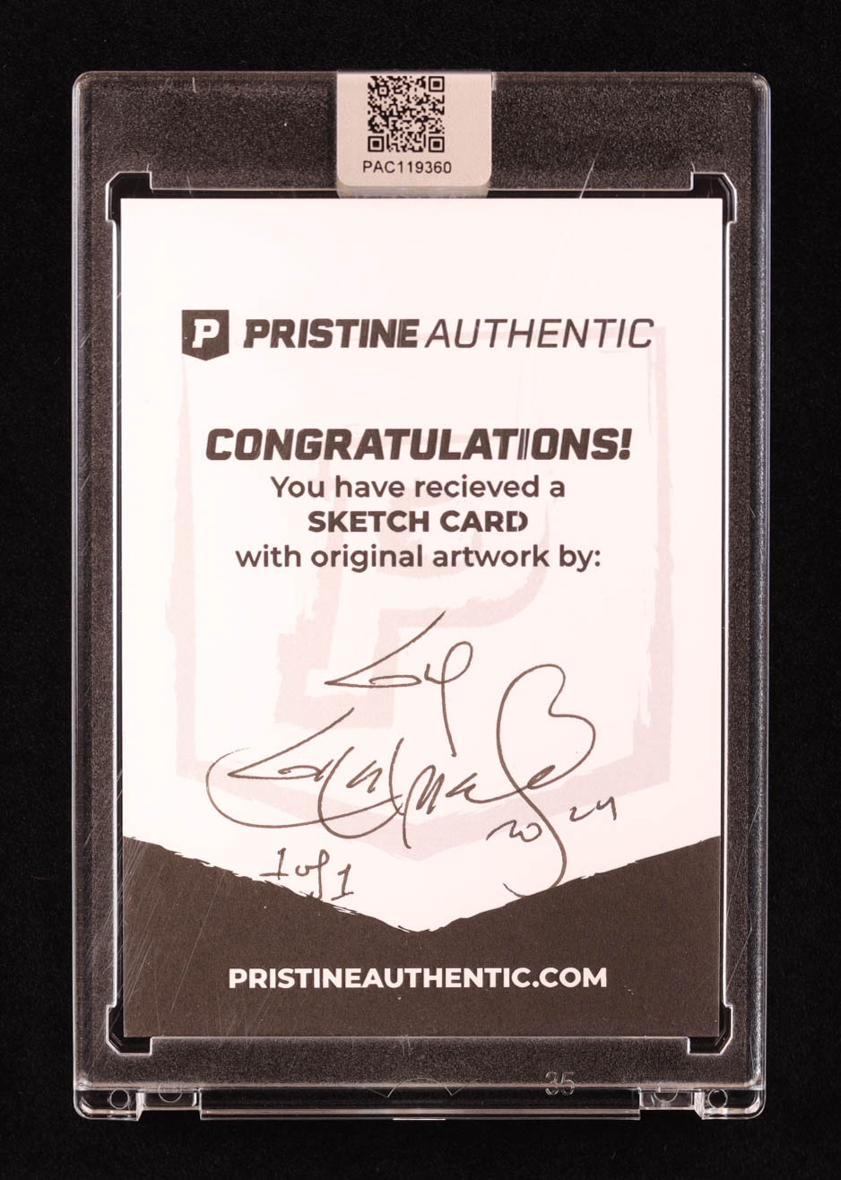 This sketch card includes original art by world-renowned illustrator, Guy Gilchrist. The card is hand-signed on the back by Gilchrist.