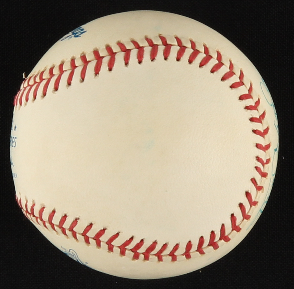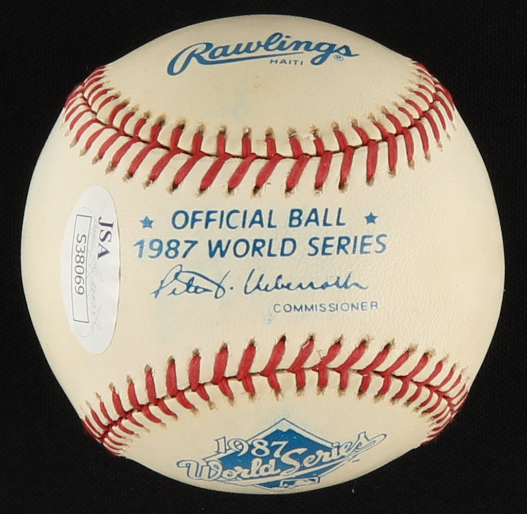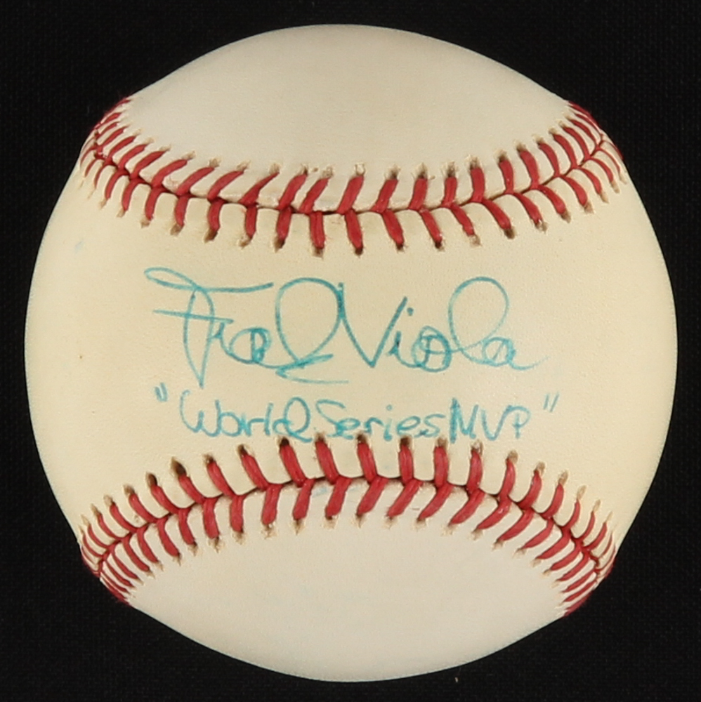Rawlings Official 1987 World Series Logo Baseball. Hand-signed and inscribed in blue ink pen by Frank Viola (Twins). Please note: The baseball is slightly toned, and has small blue marks all throughout.
