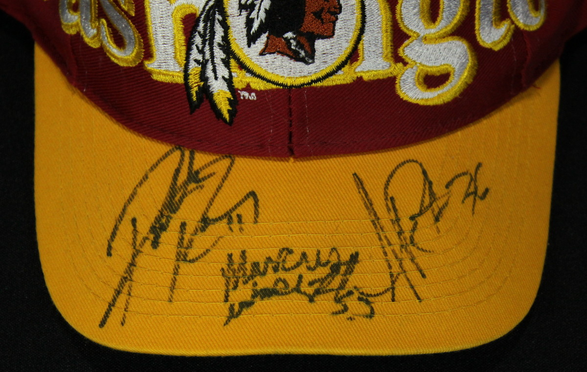 Logo 7 adjustable Redskins hat. Hand-signed in black felt tip pen by Sean Taylor (D 2007), Marcus Washing and Patrick Ramsey. Autographs include an official James Spence Authentication (JSA) hologram and matching COA for authenticity purposes.