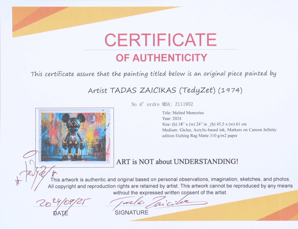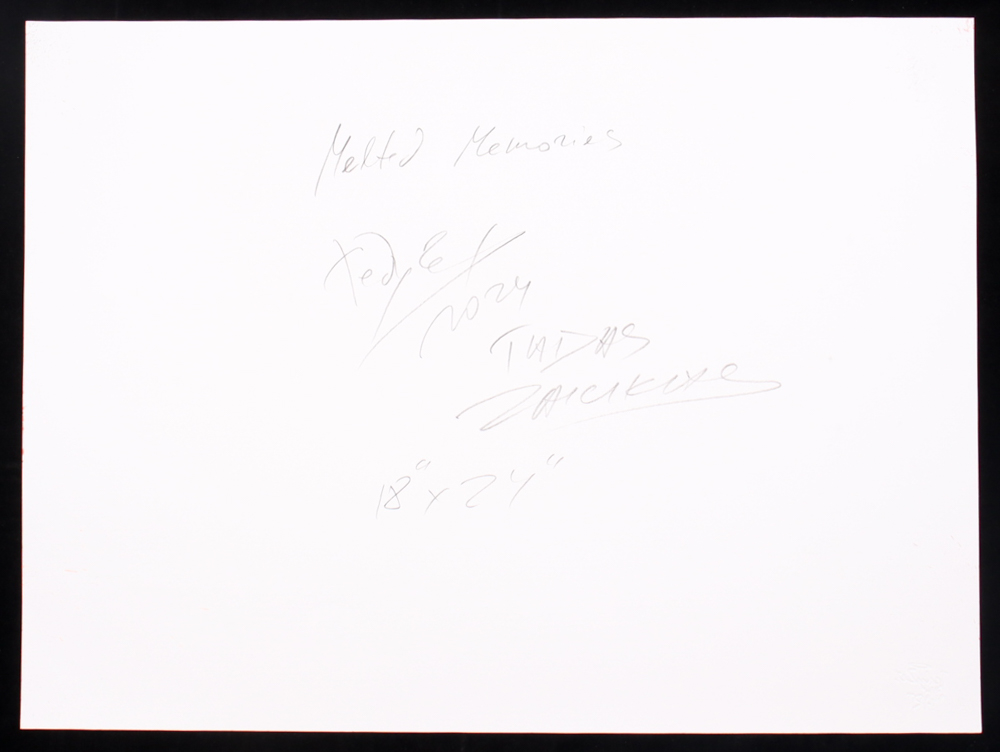 This fine art print with acrylic paint on premium 310 GSM paper measures 18" x 24" in size. The piece is titled "Melted Memories" and is hand-signed and titled by the artist, Tadas Zaicikas (TedyZet).
