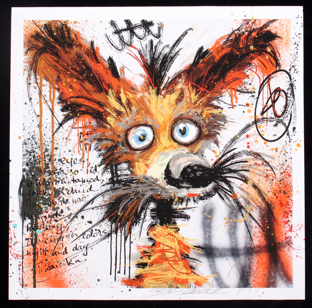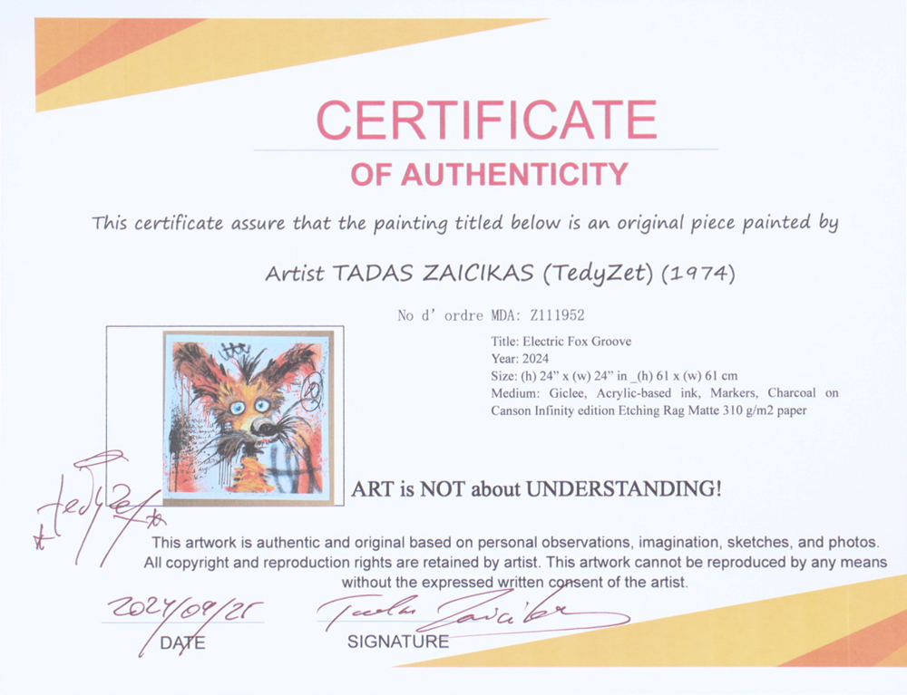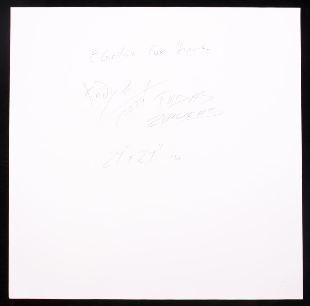 This fine art print with acrylic paint on premium 310 GSM paper measures 24" x 24" in size. The piece is titled "Electric Fox Groove" and is hand-signed and titled by the artist, Tadas Zaicikas (TedyZet).