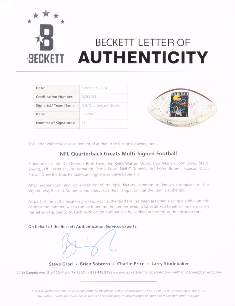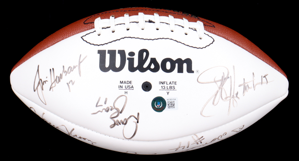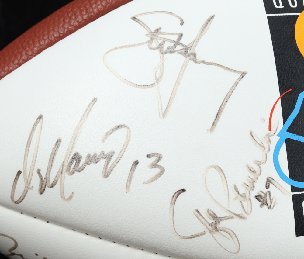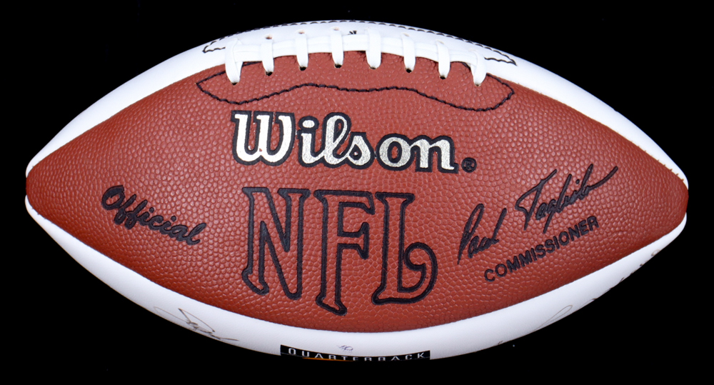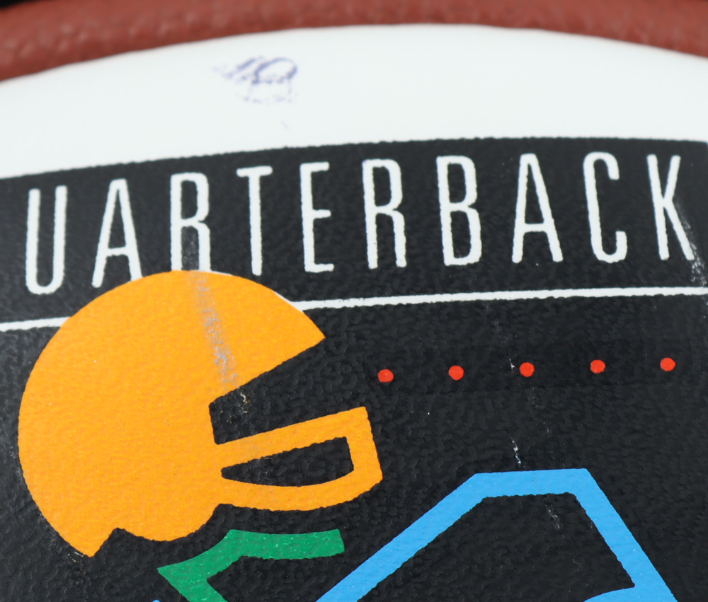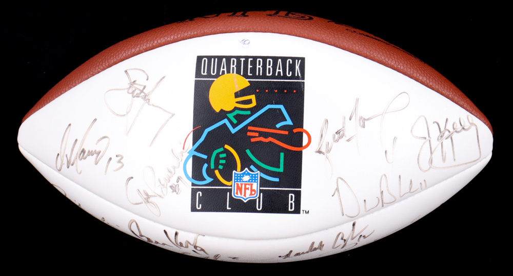 Wilson NFL Quarterback Club Logo football. Hand-signed by Dan Marino, Brett Favre, Jim Kelly, Warren Moon, Troy Aikman, John Elway, Steve Young, Jeff Hostetler, Jim Harbaugh, Bernie Kosar, Neil O'Donnell, Rick Mirer, Boomer Esiason, Dave Brown, Drew Bledsoe, Randall Cunningham, & Steve Beuerlein.