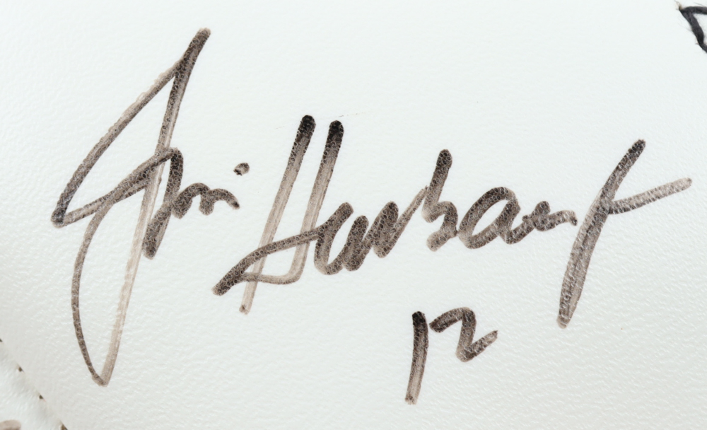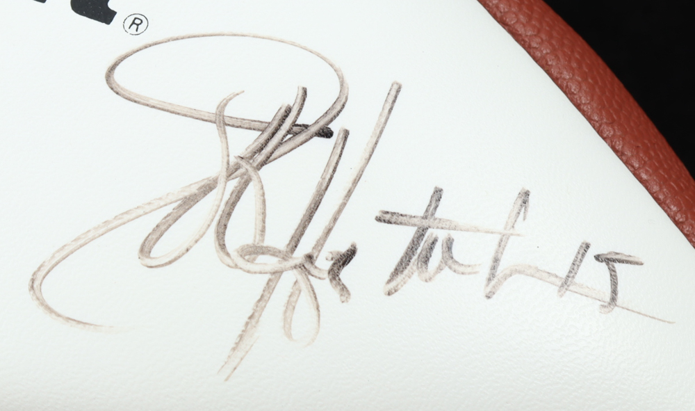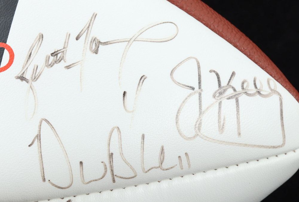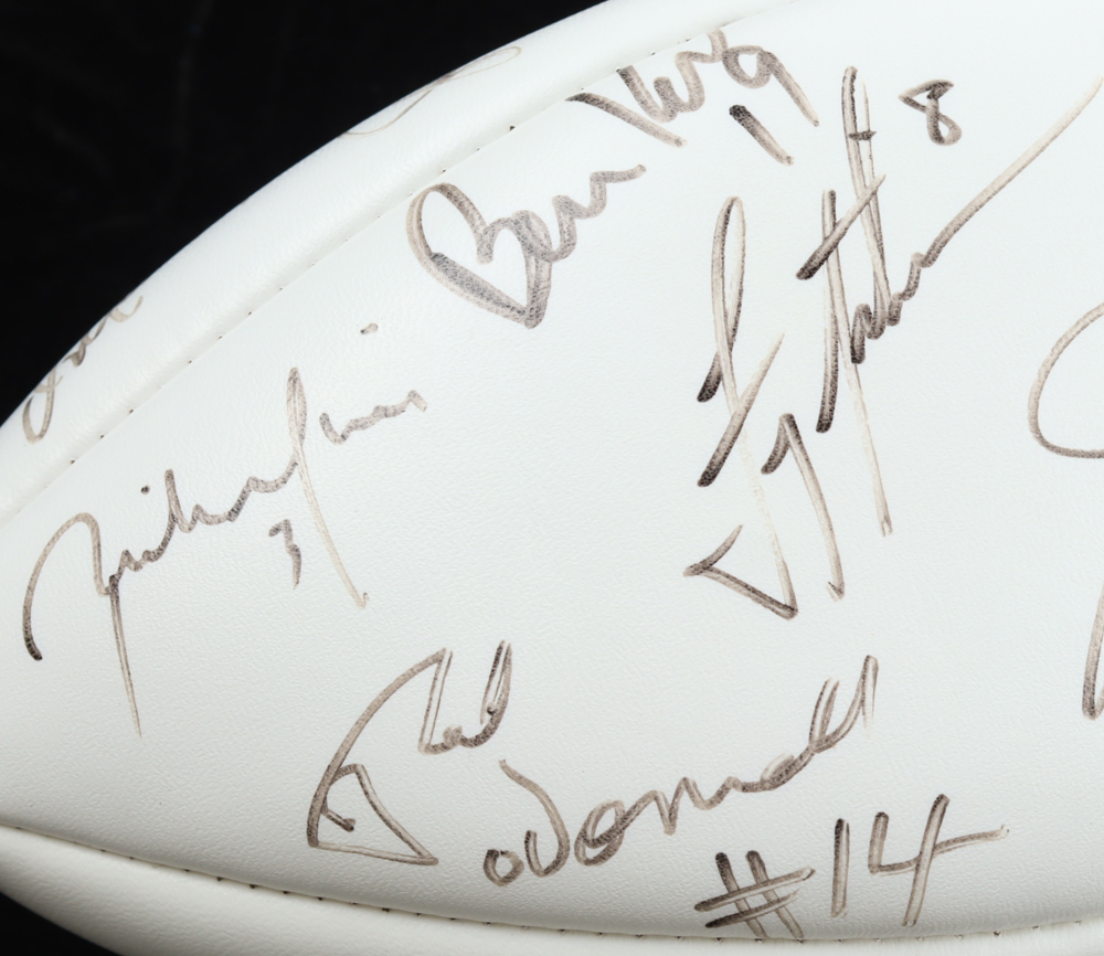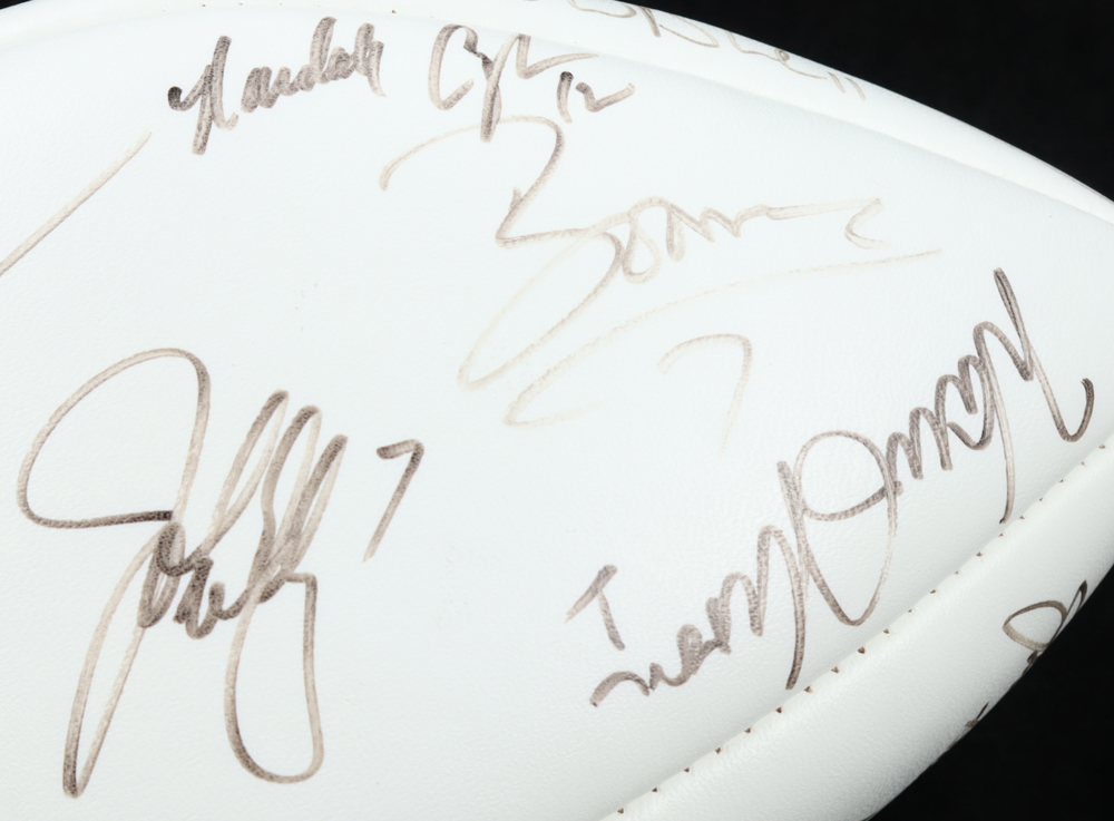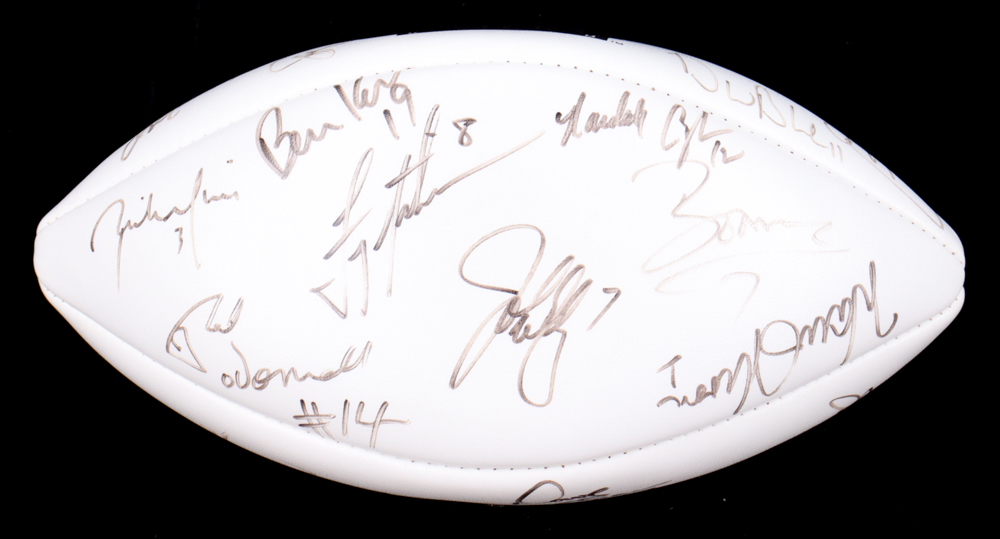 Wilson NFL Quarterback Club Logo football. Hand-signed by Dan Marino, Brett Favre, Jim Kelly, Warren Moon, Troy Aikman, John Elway, Steve Young, Jeff Hostetler, Jim Harbaugh, Bernie Kosar, Neil O'Donnell, Rick Mirer, Boomer Esiason, Dave Brown, Drew Bledsoe, Randall Cunningham, & Steve Beuerlein.