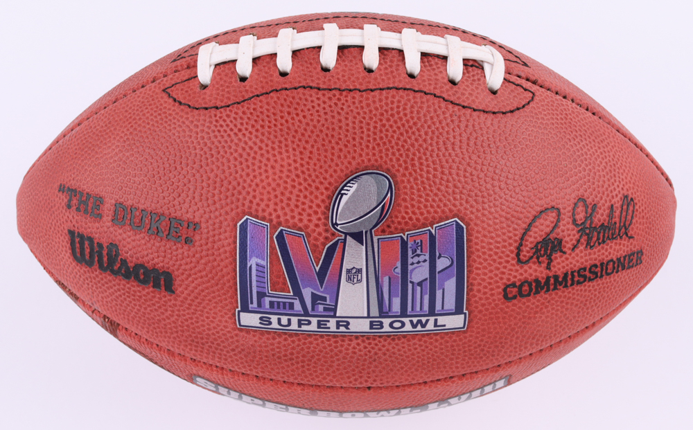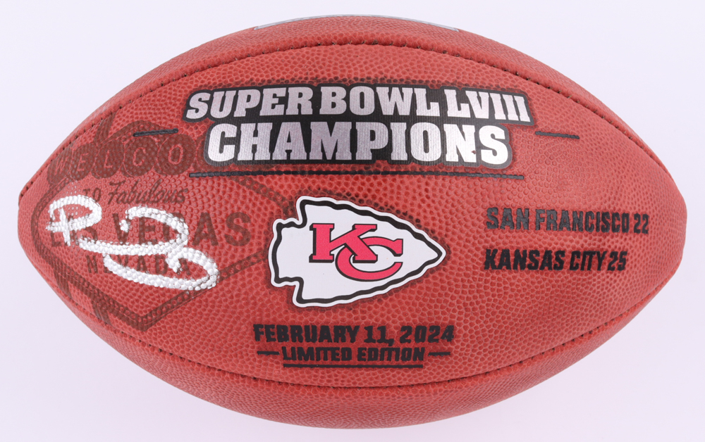 Wilson Super Bowl LVIII commemorative "The Duke" NFL Official Game football. Hand-signed by Patrick Mahomes.