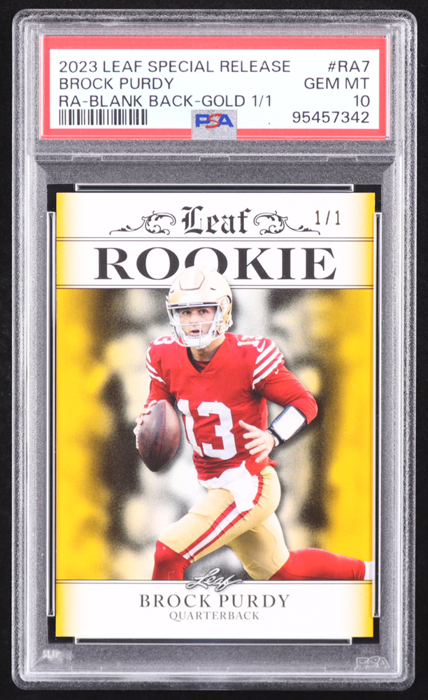 Brock Purdy 2023 Leaf Special Release Rookie Achievement Blank Back Gold #RA07 #1/1 (PSA 10)
