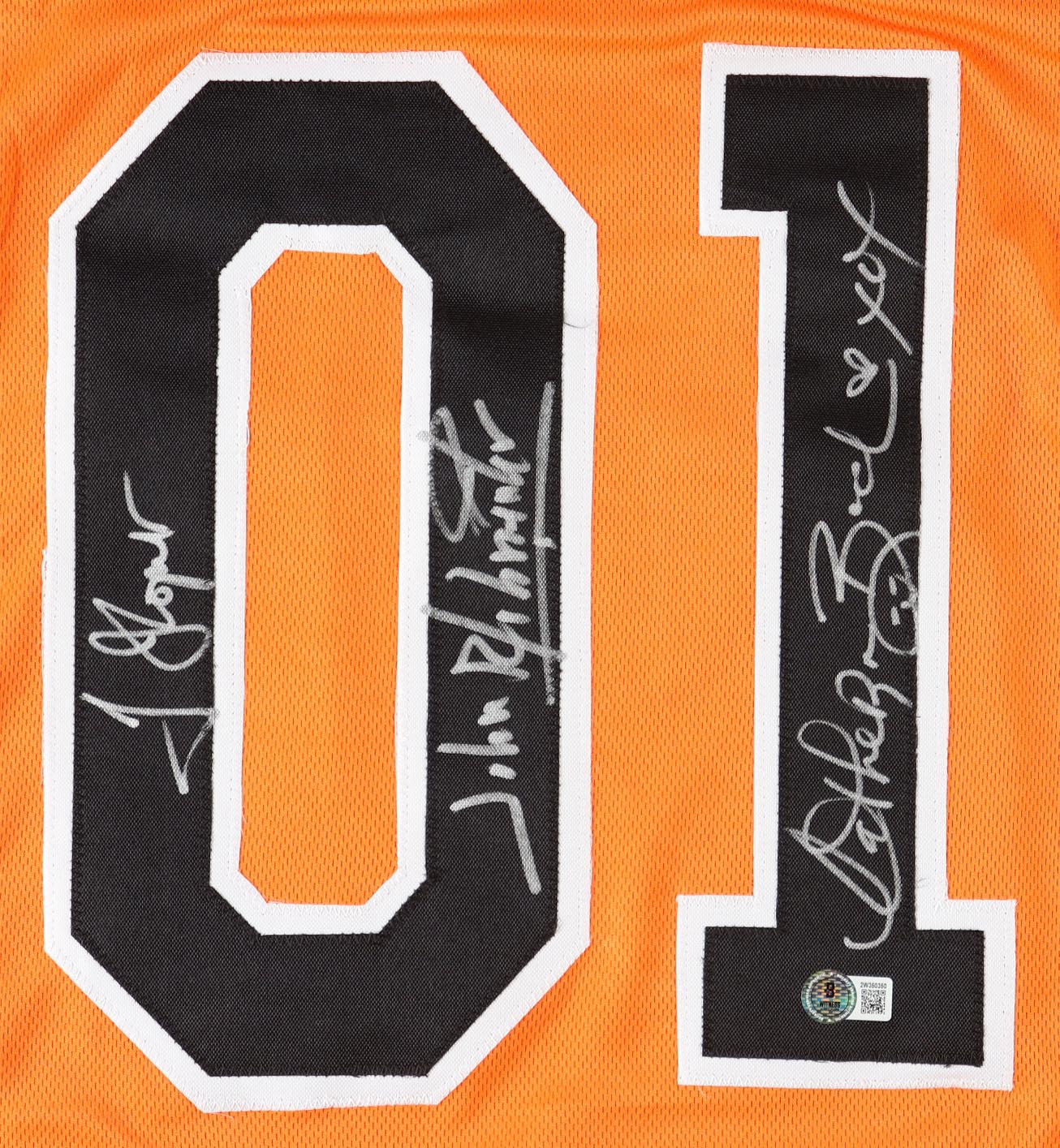 Custom jersey with everything sewn on, size XL. Hand-signed and inscribed by John Schneider (Bo Duke), Catherine Bach (Daisy Duke), and Tom Wopat (Luke Duke).