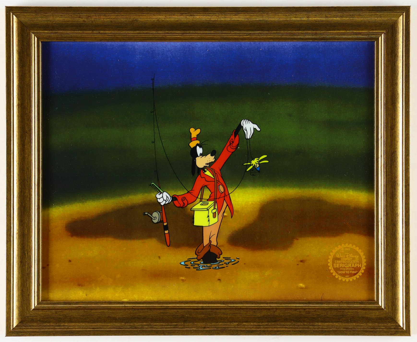 Custom frame measures approximately 13" x 16" in size and features a 2-Piece serigraph cel of Walt Disney's "Goofy Learning to Fish". This serigraph is limited edition. Please note, the item is not signed.