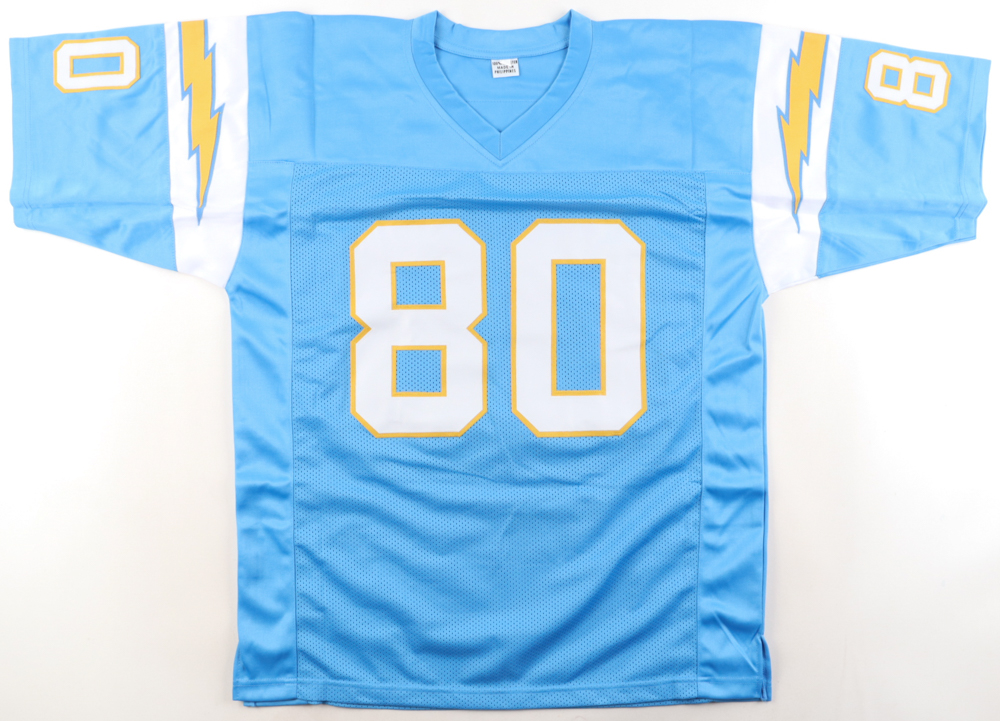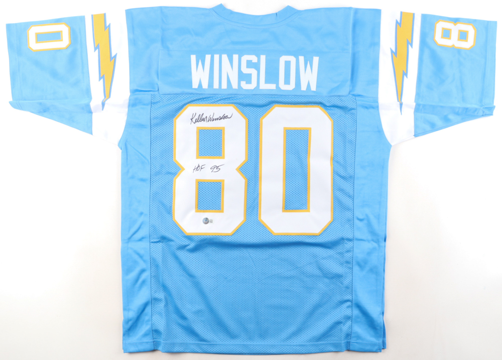 Custom jersey. Everything is sewn on, size L. Hand-signed and inscribed by Kellen Winslow (HOF).