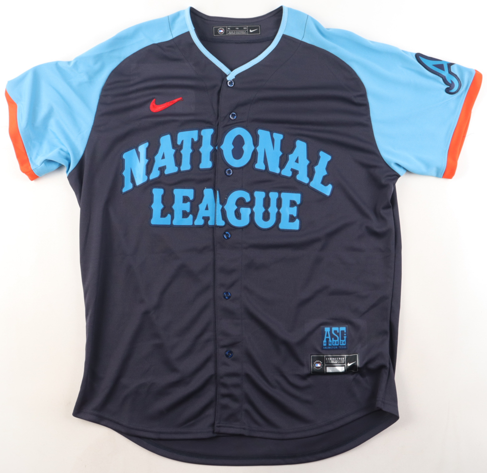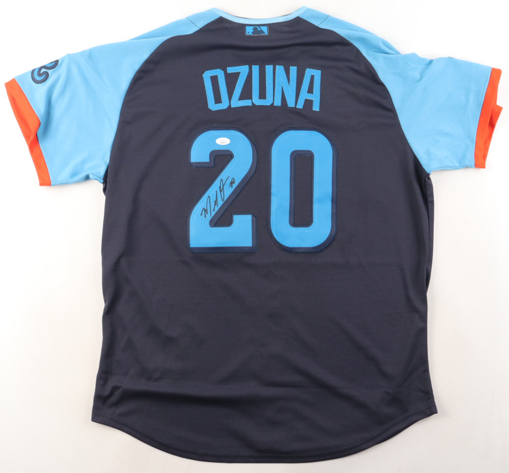 Nike jersey. Everything sewn on, size XL. Hand-signed by Marcell Ozuna.
