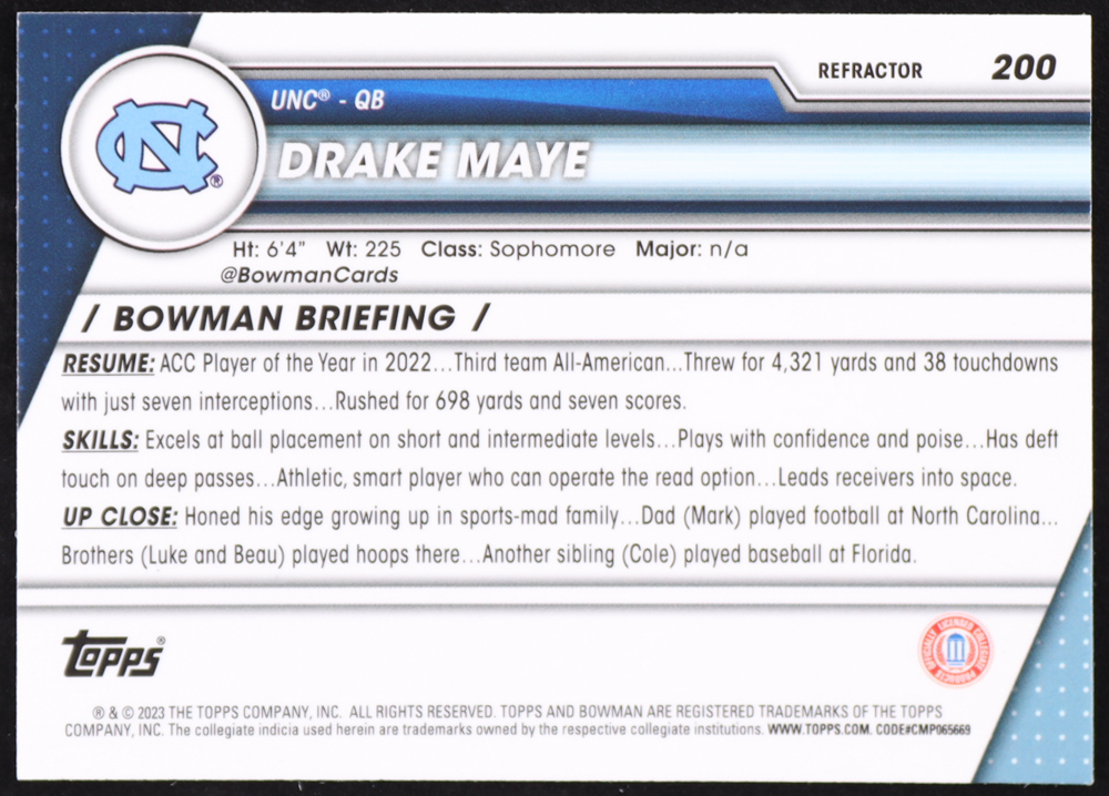 Drake Maye 2023 Bowman Chrome University Refractors #200 RC