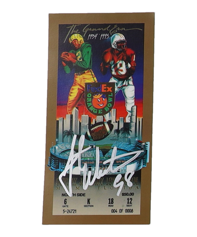FedEx Orange Bowl "The Grand Era: 1934-1995" replica game ticket measures 4" x 8" and has been hand-signed by Grant Wistrom.