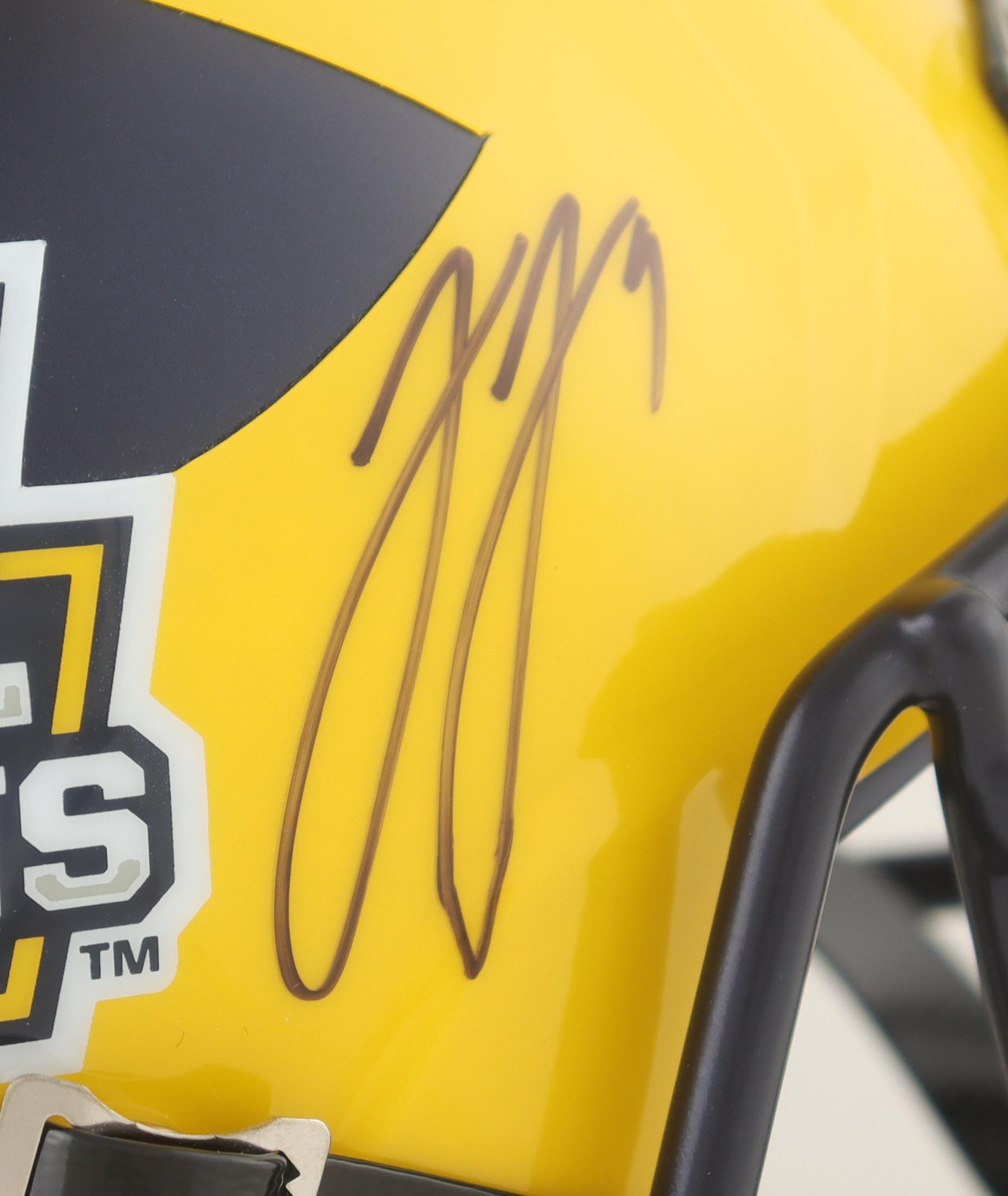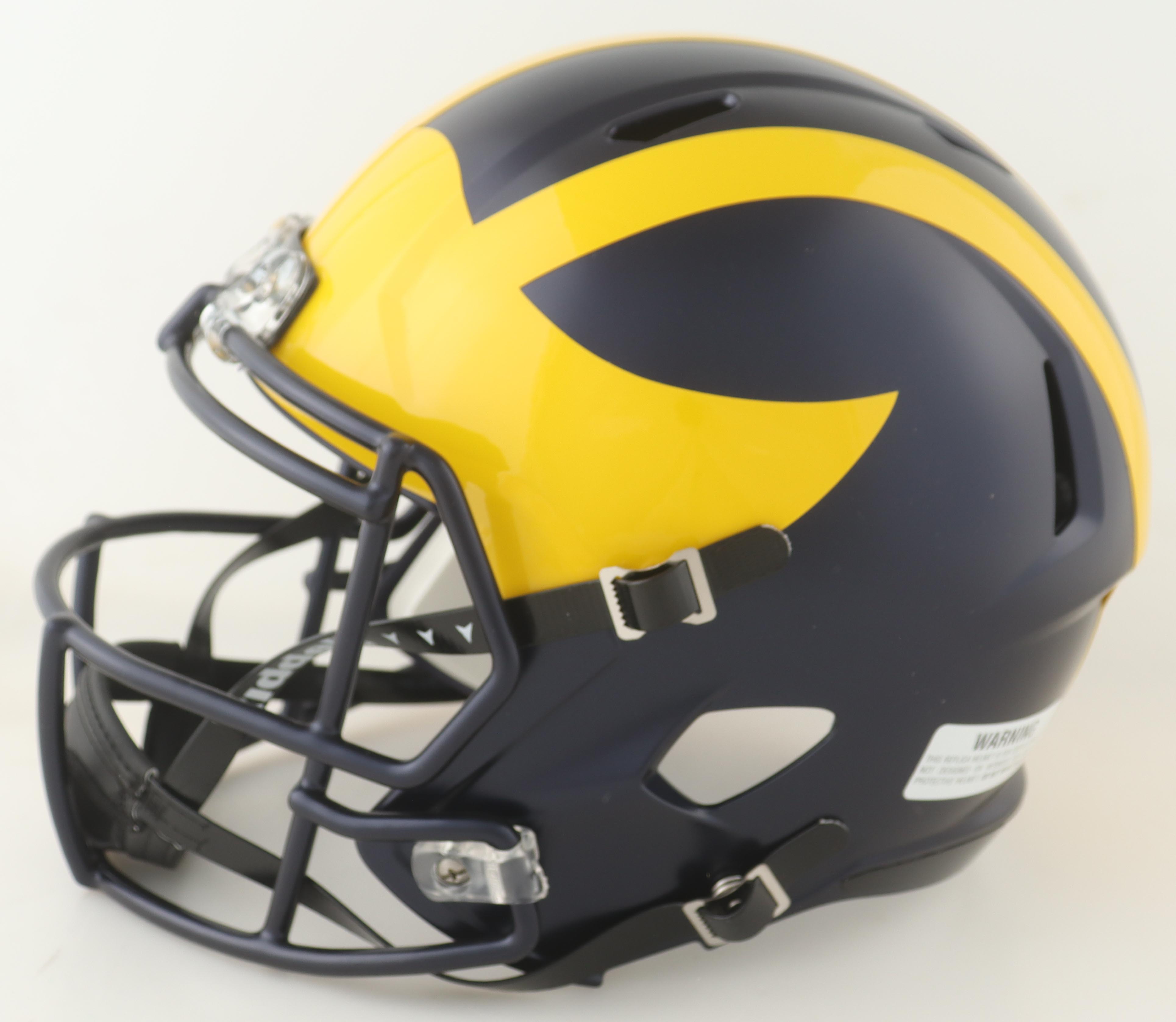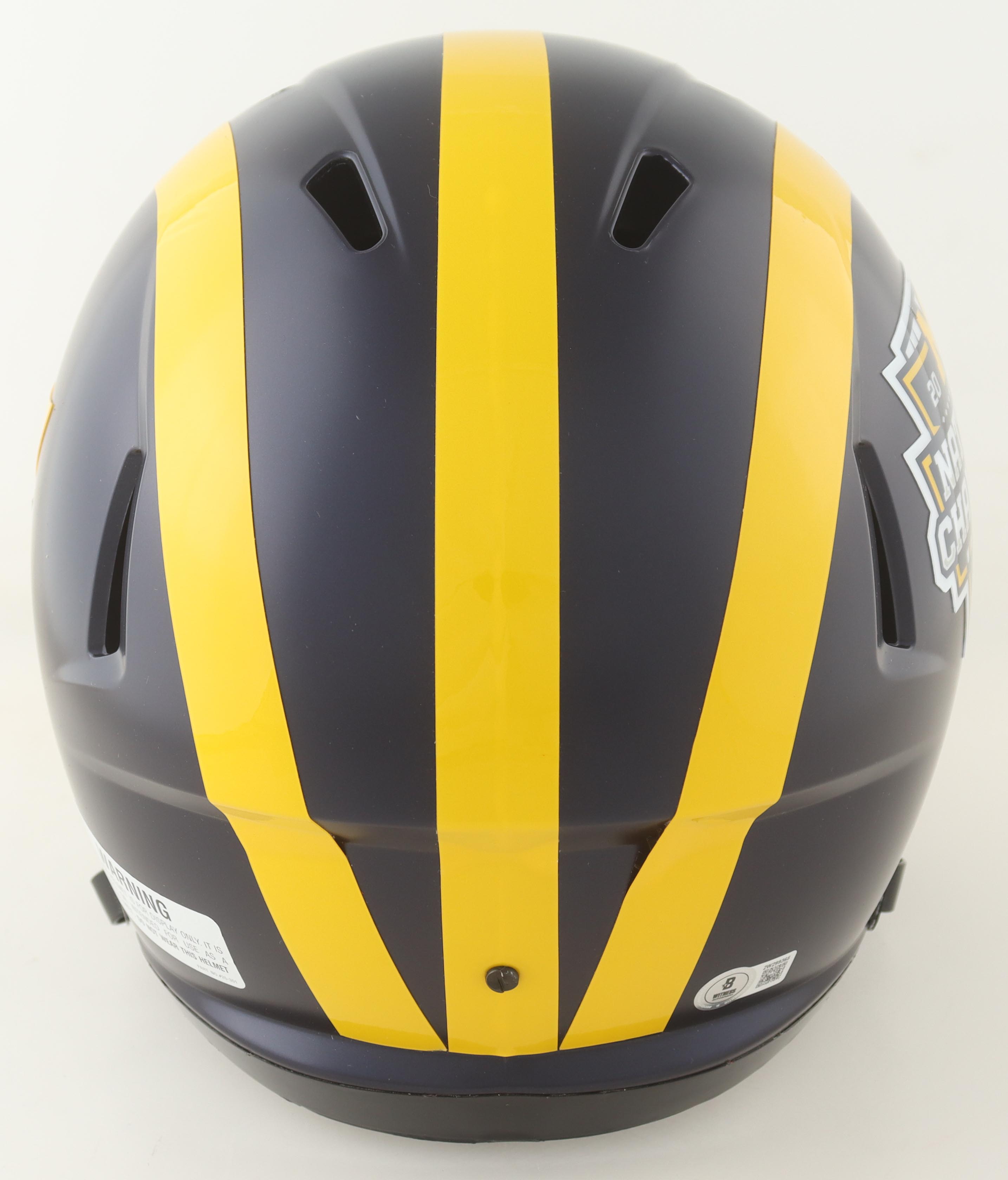Riddell Michigan Wolverines 2023 National Champions Logo full-size replica speed helmet has been hand-signed by J.J. McCarthy.