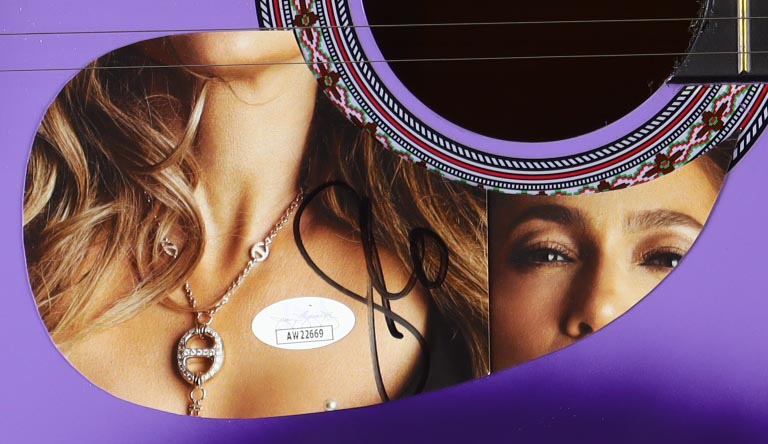 Acoustic guitar measures approximately 38" in length and has been hand-signed on a cut that has been repurposed as the pick-guard by Jennifer Lopez.