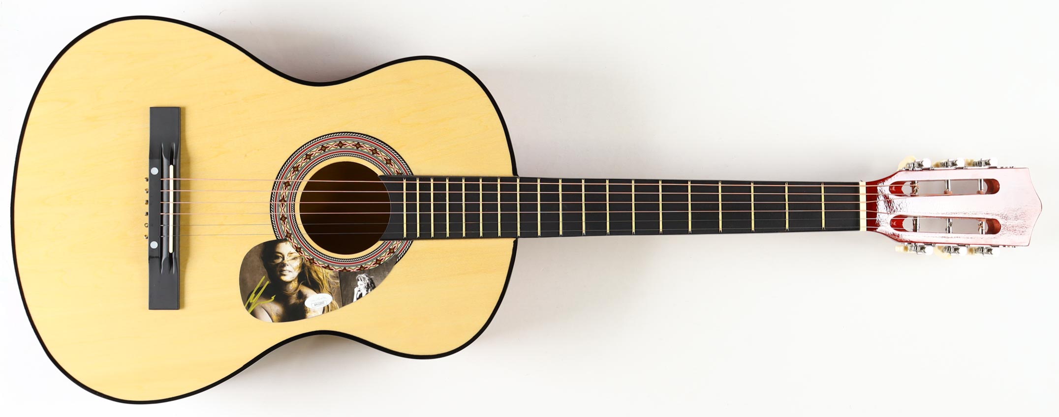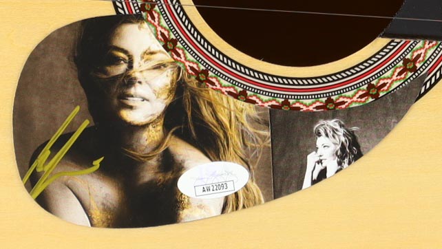 Acoustic guitar measures approximately 38" in length and has been hand-signed on a cut that has been repurposed as the pick-guard by Shania Twain.