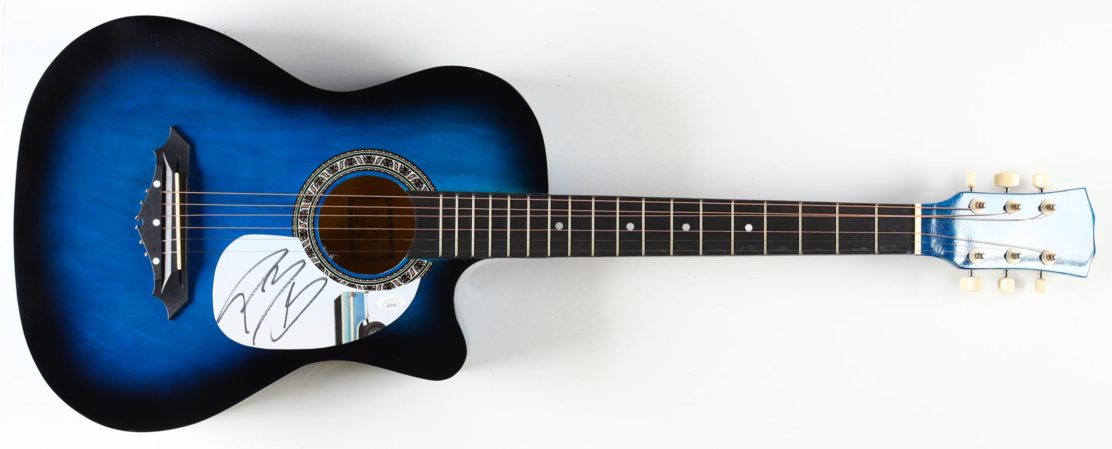 Acoustic guitar measures approximately 38" in length and has been hand-signed on a CD cover repurposed as a pickguard by Post Malone.