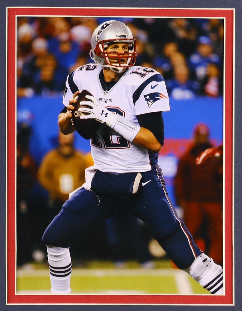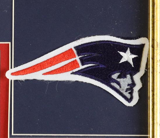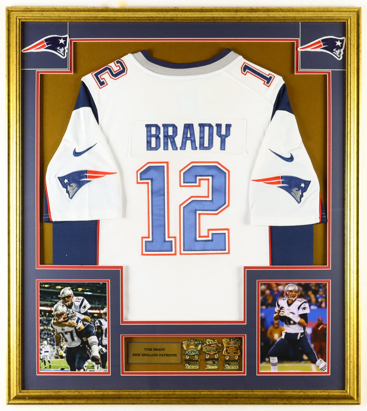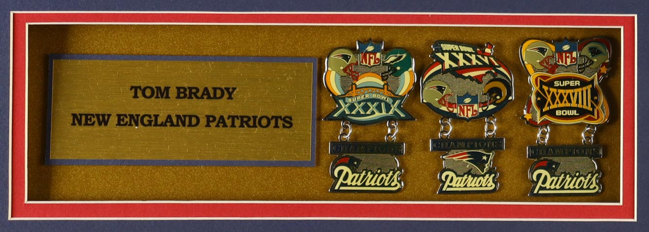 Custom framed display measures approximately 32" x 36" in size and features an unsigned Tom Brady Nike jersey and also includes (2) Cloth logo patches, (2) photo and (3) Official Super Bowl XXXVI, XXXVIII and XXXIX Pins. Please note, the display is unsigned.