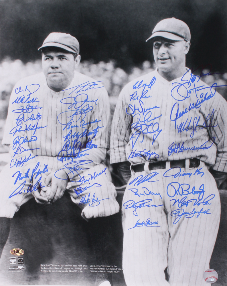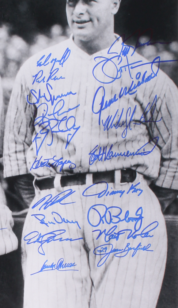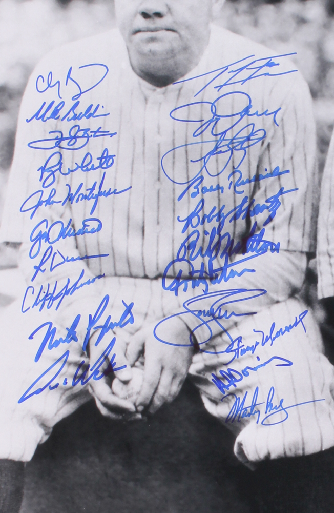 Photo measures 16" x 20" and has been hand-signed in blue felt-tip pen by (40) members of the New York Yankees including Al Downing, Bobby Shantz, Joe Pepitone, Bobby Richardson, Ron Blomberg, Jimmy Key, Hector Lopez, Ed Yarnell, Gene Micheal, Cliff Johnson and others. Please note, photograph has not been signed by Babe Ruth or Lou Gehrig.