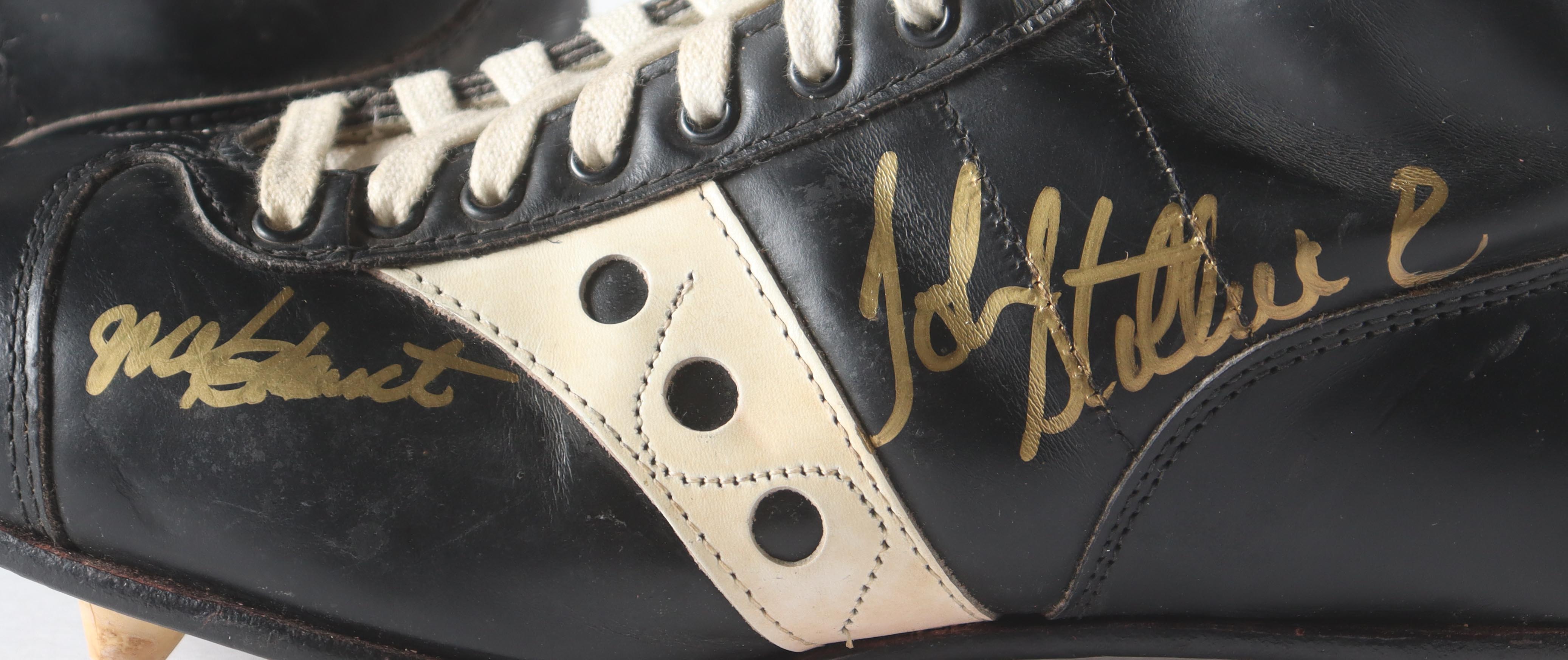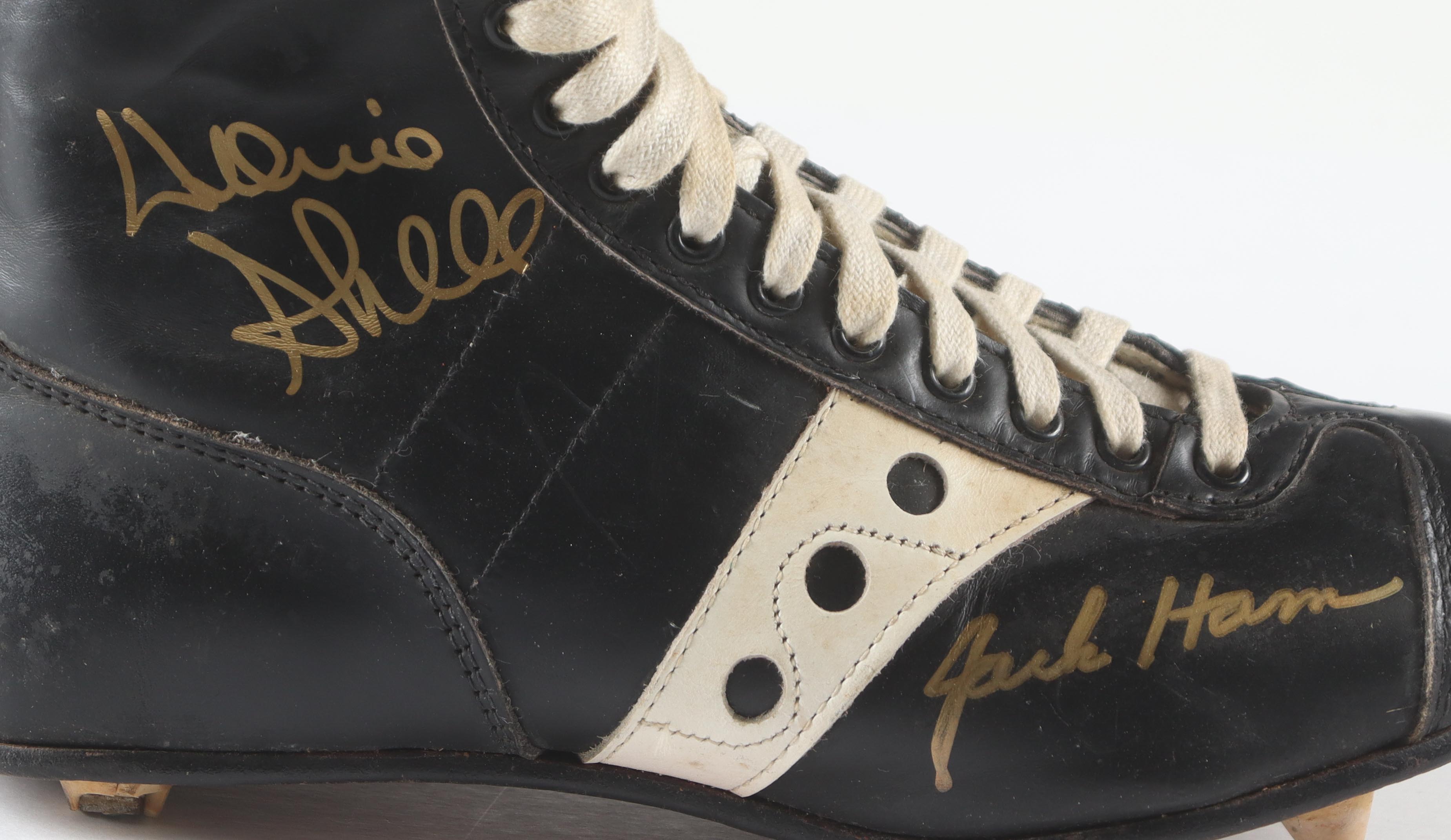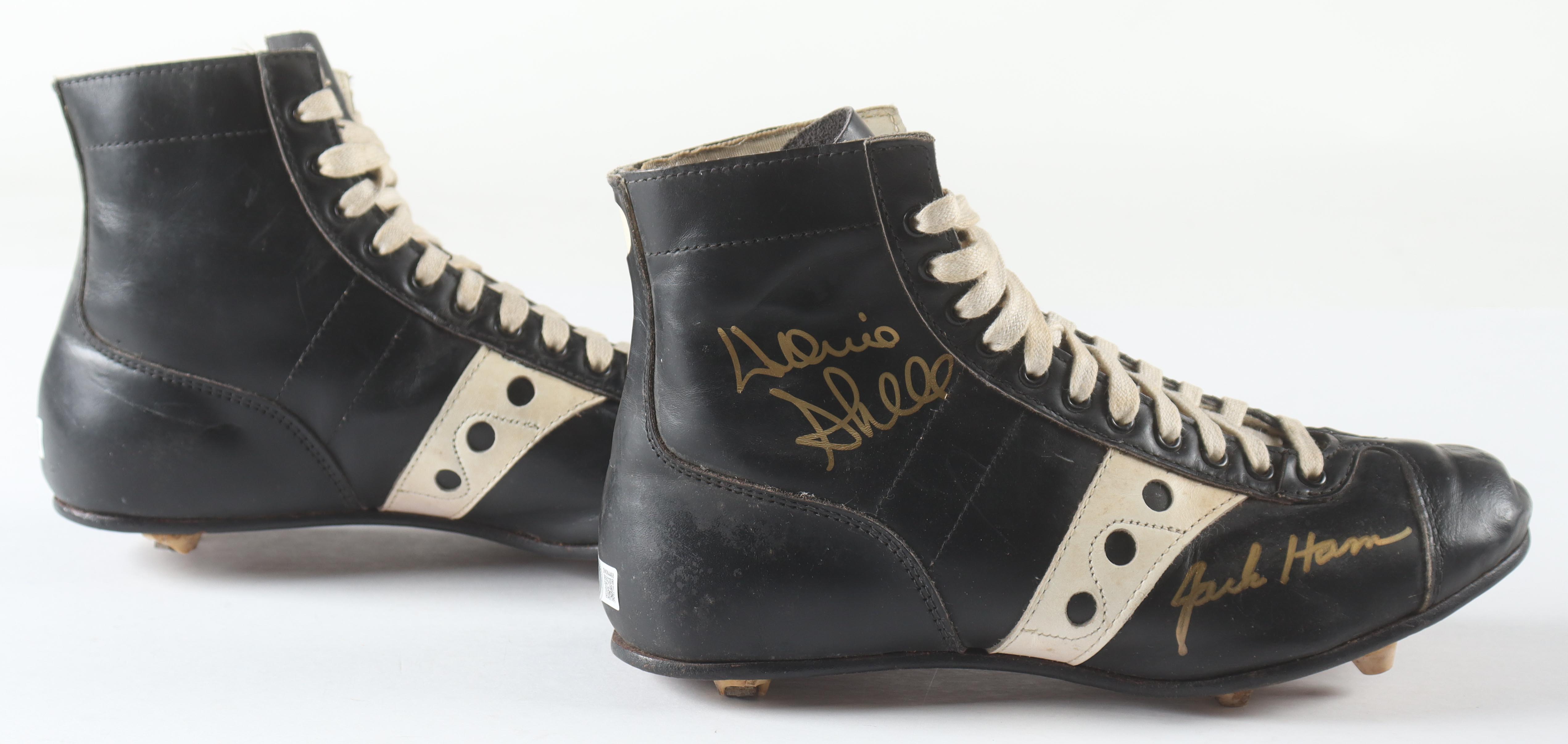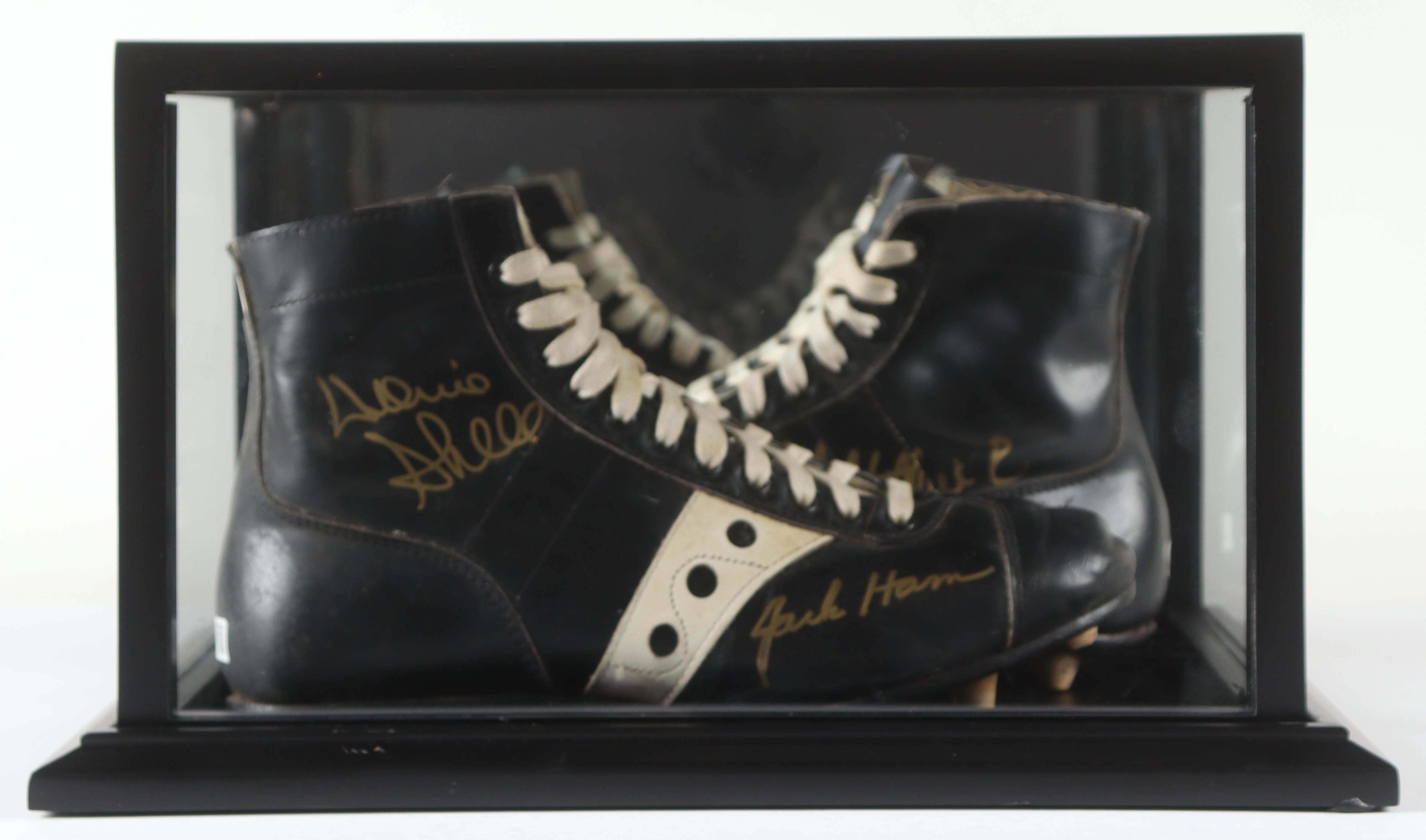 Pair of (2) football cleats have been hand-signed by Jack Ham, Melt Blount, Donnie Shell & John Stallworth. Display case is included as shown. Please note cleats are heavily damaged and worn, see photos for more details.