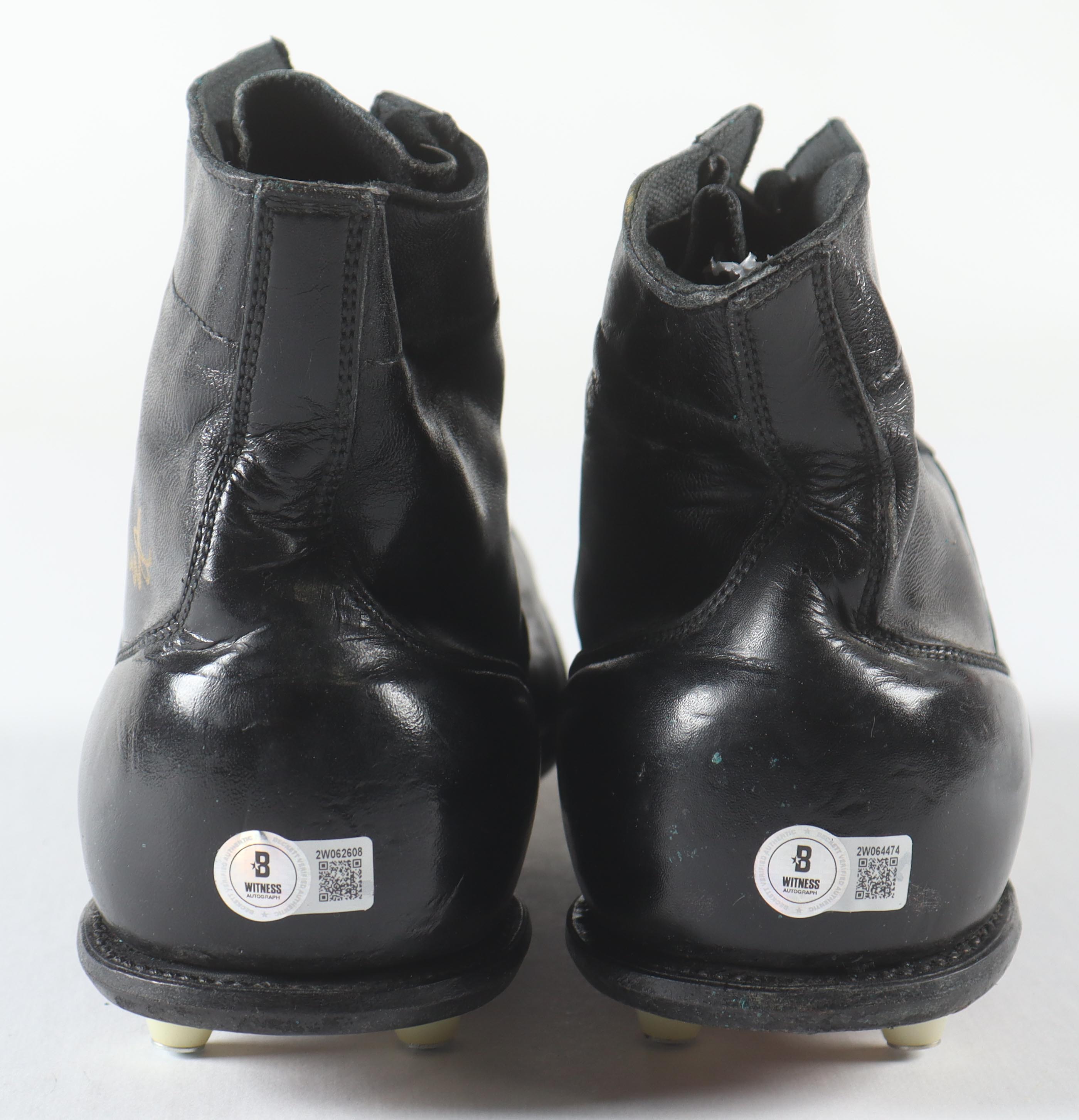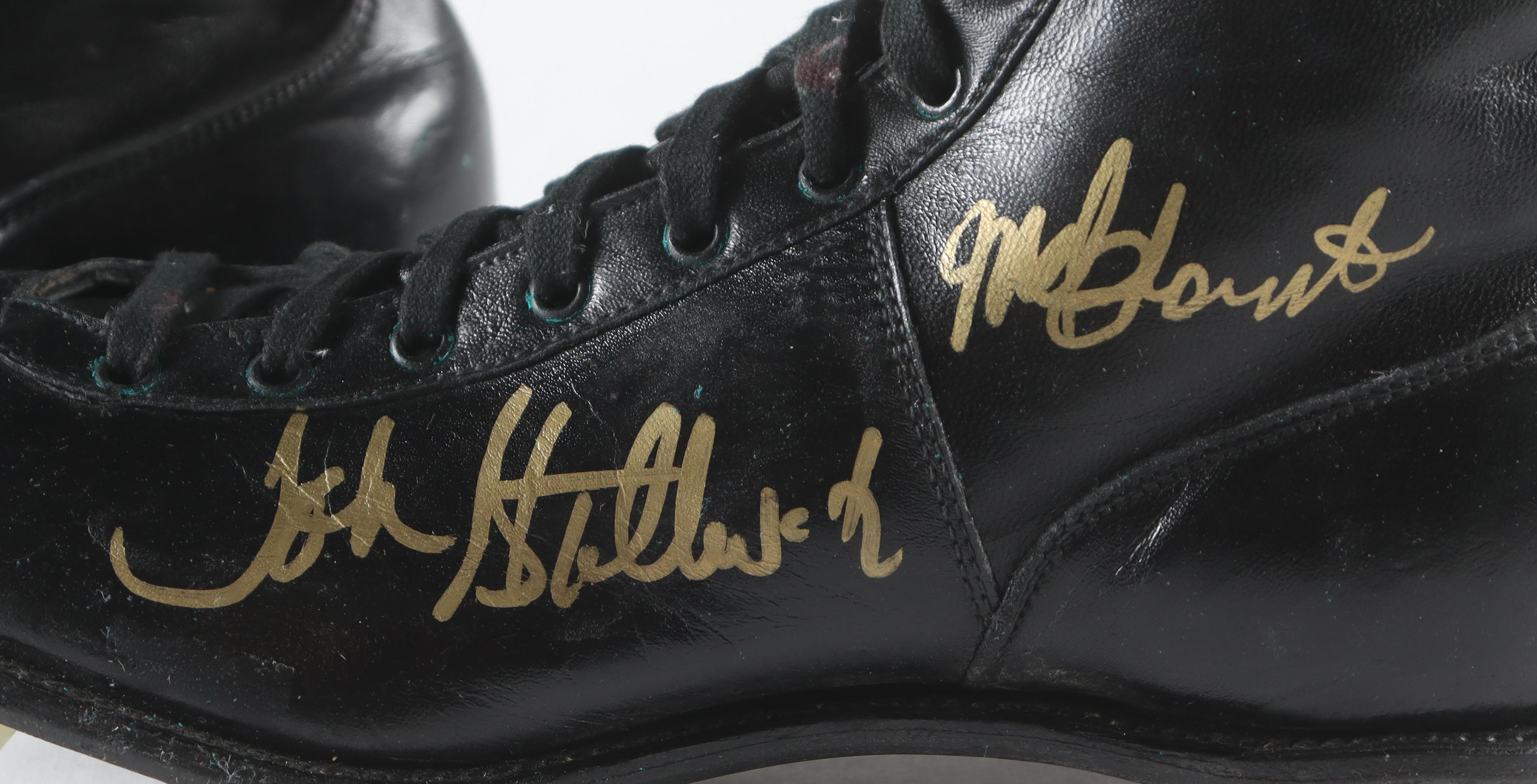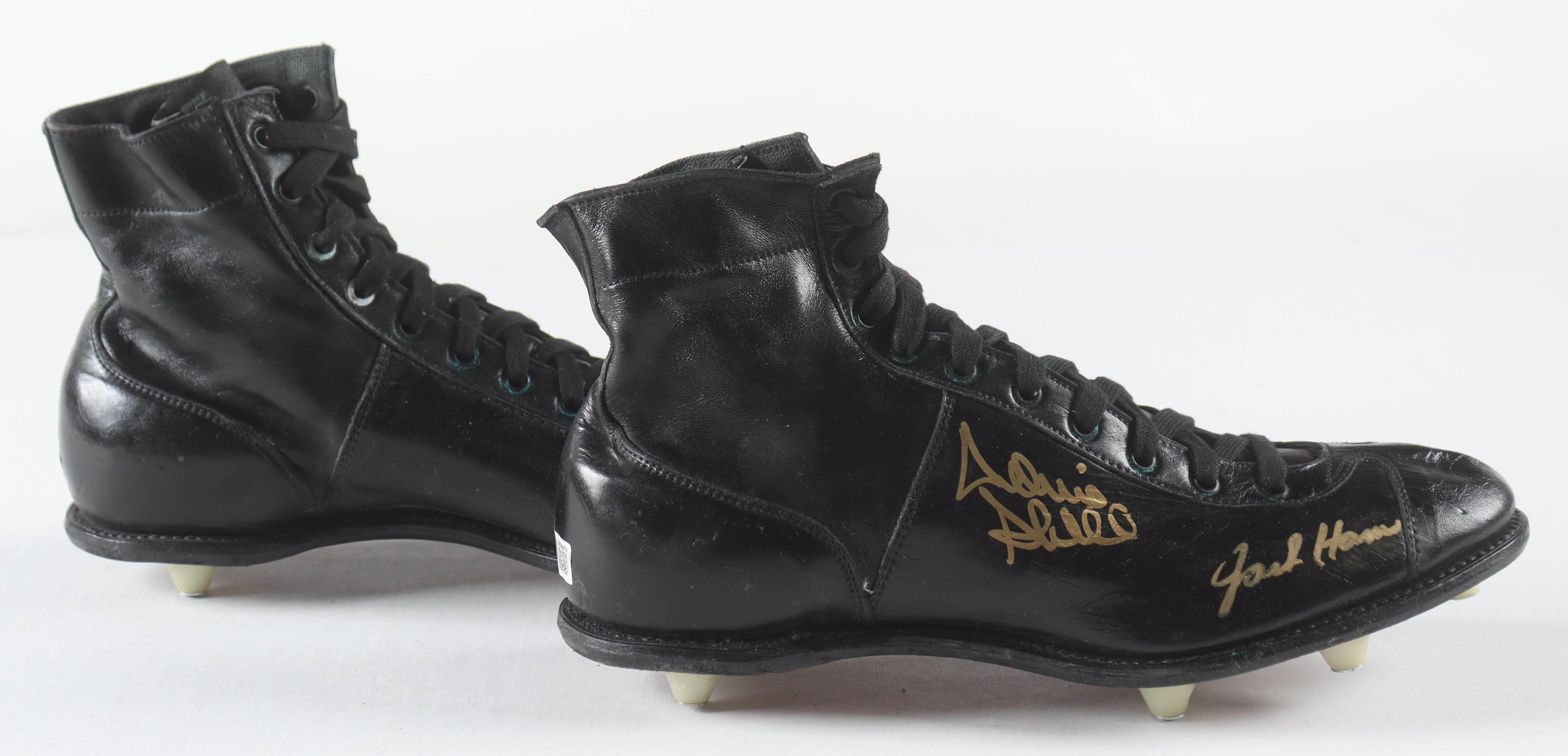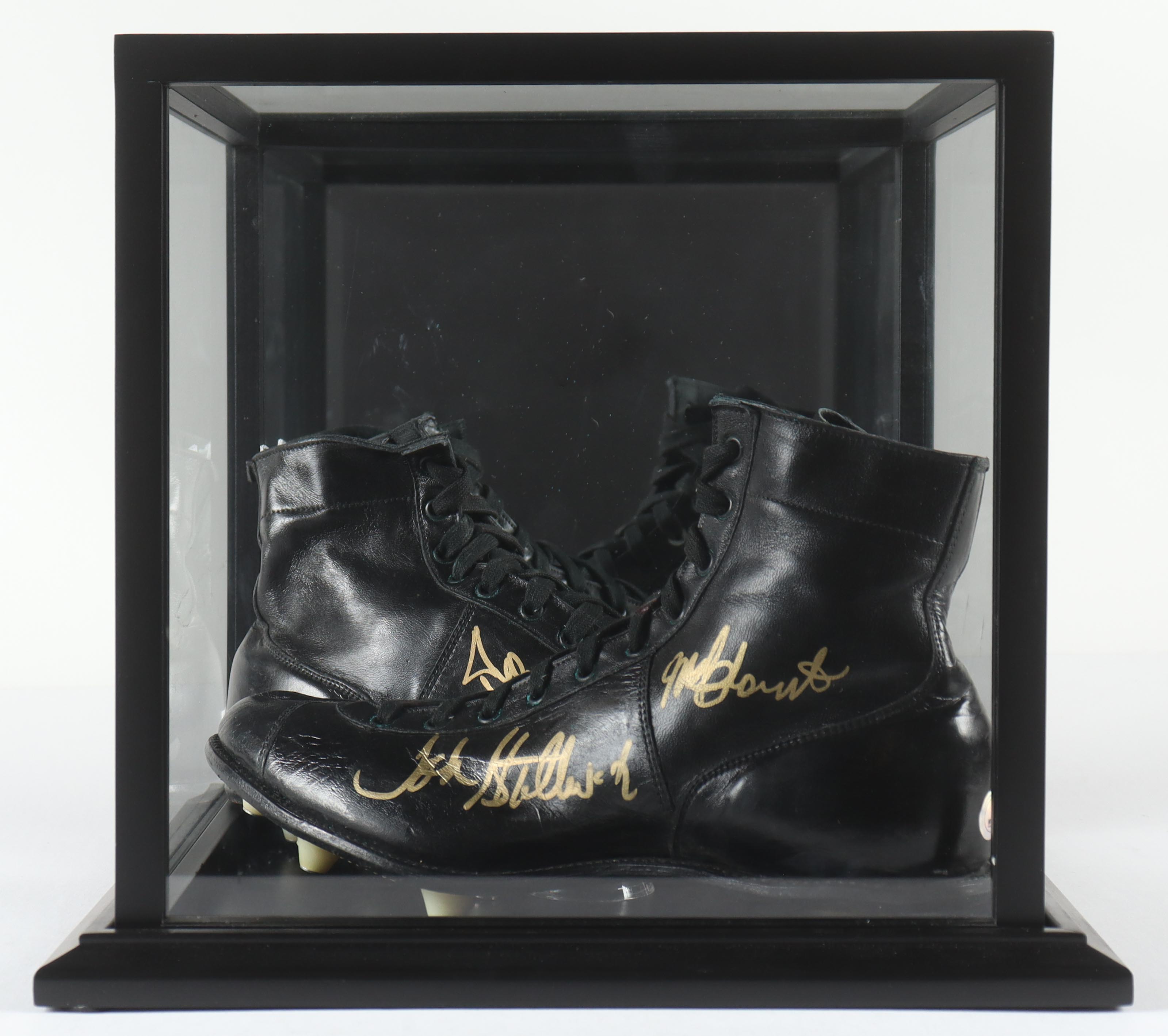 Pair of (2) football cleats have been hand-signed by Jack Ham, Melt Blount, Donnie Shell & John Stallworth. Display case is included as shown. Please note, creasing and wear throughout the cleats. Refer to photos for more details.