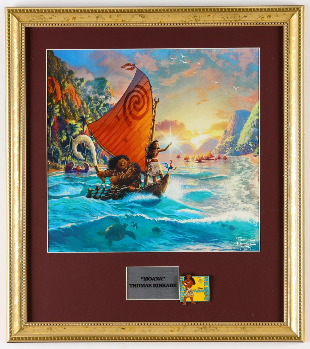 Custom frame measures approximately 16" x 18" in size. The display features a Thomas Kinkade (D. 2012) art print and also includes a Moana movie pin. Please note, the display is unsigned.