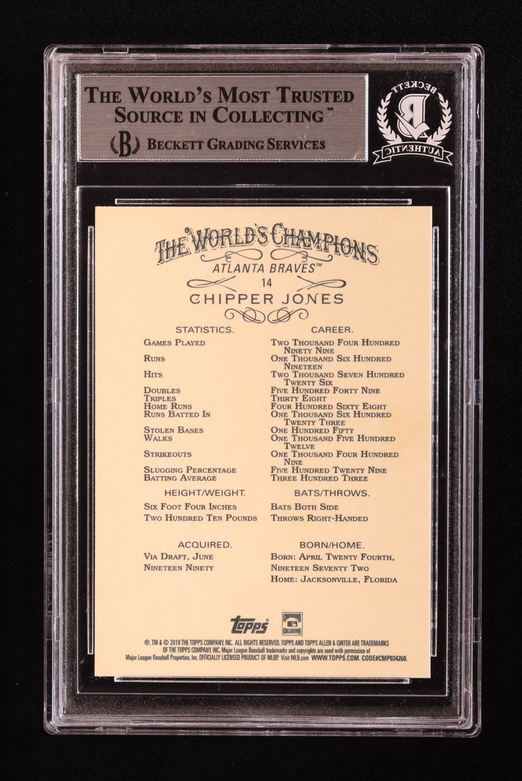 Chipper Jones Signed 2019 Topps Allen and Ginter #14 (BGS)