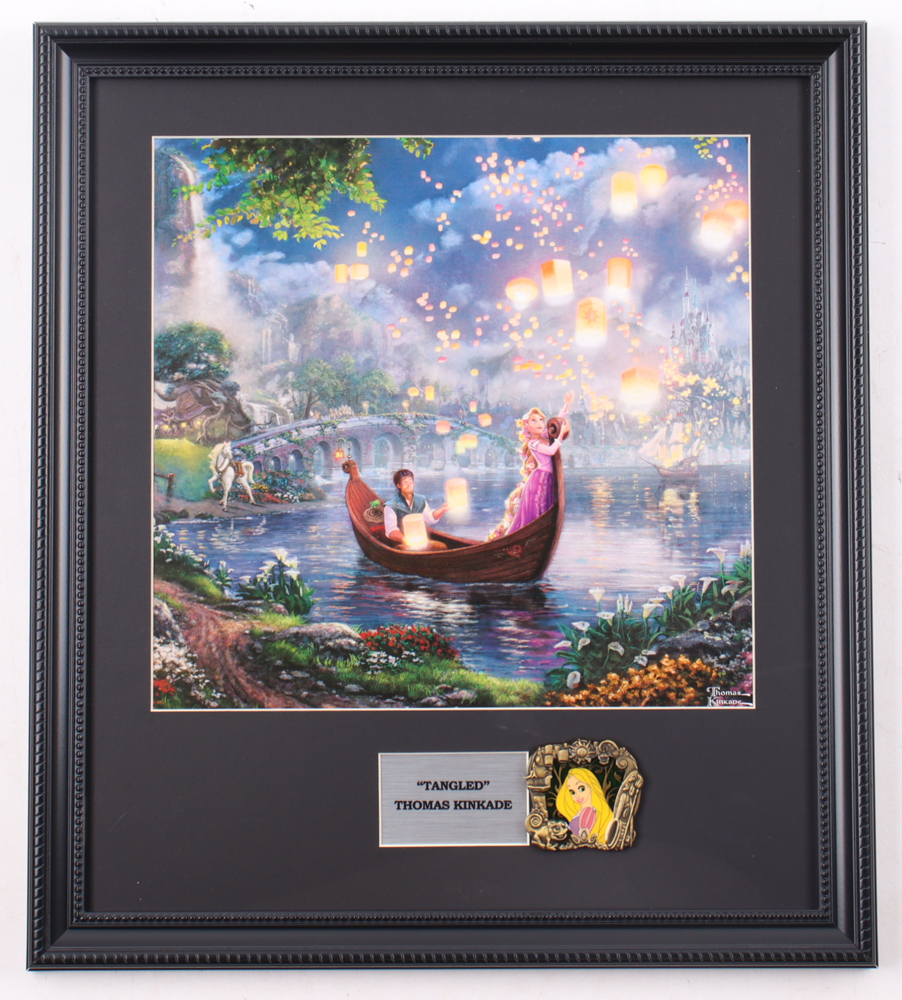 Custom frame measures approximately 16" x 18" in size and features a print of "Tangled" by Thomas Kinkade (D. 2012). The display also includes a Rapunzel Stained Glass Pin. The pin is limited edition out of 300. Please note, the display is unsigned.