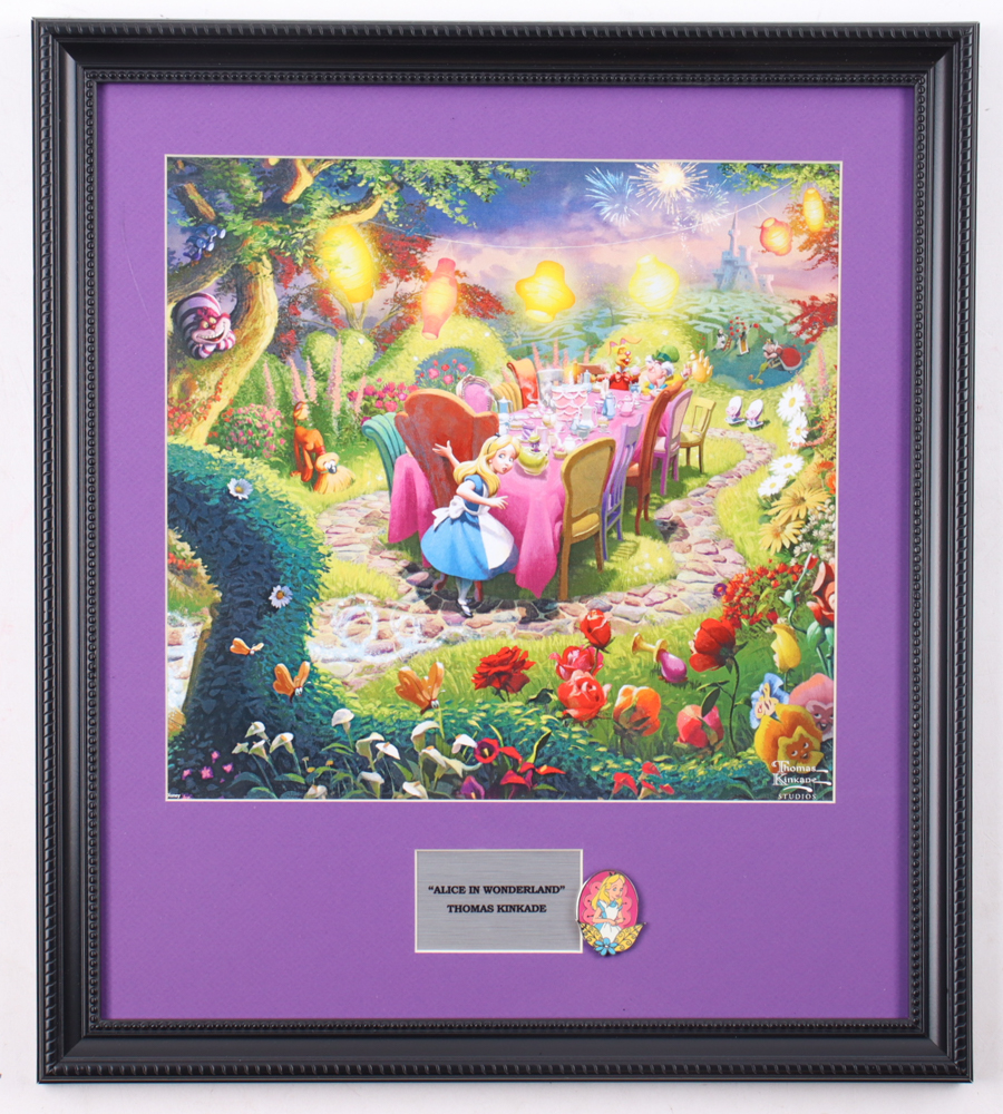 Custom frame measures approximately 16" x 18" in size and features a print of "Alice in Wonderland" by Thomas Kinkade (D. 2012). The display also features a retired Alice Pin. Please note, the display is unsigned.