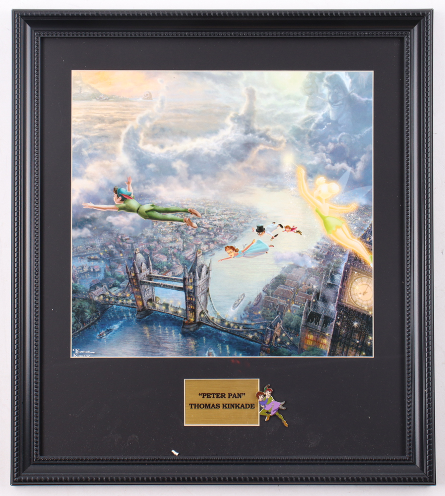 Custom frame measures approximately 16" x 18" in size and features a print of "Peter Pan" by Thomas Kinkade (D. 2012). The display also includes a Peter Pan and Jane Character Pin. Please note, the display is unsigned.