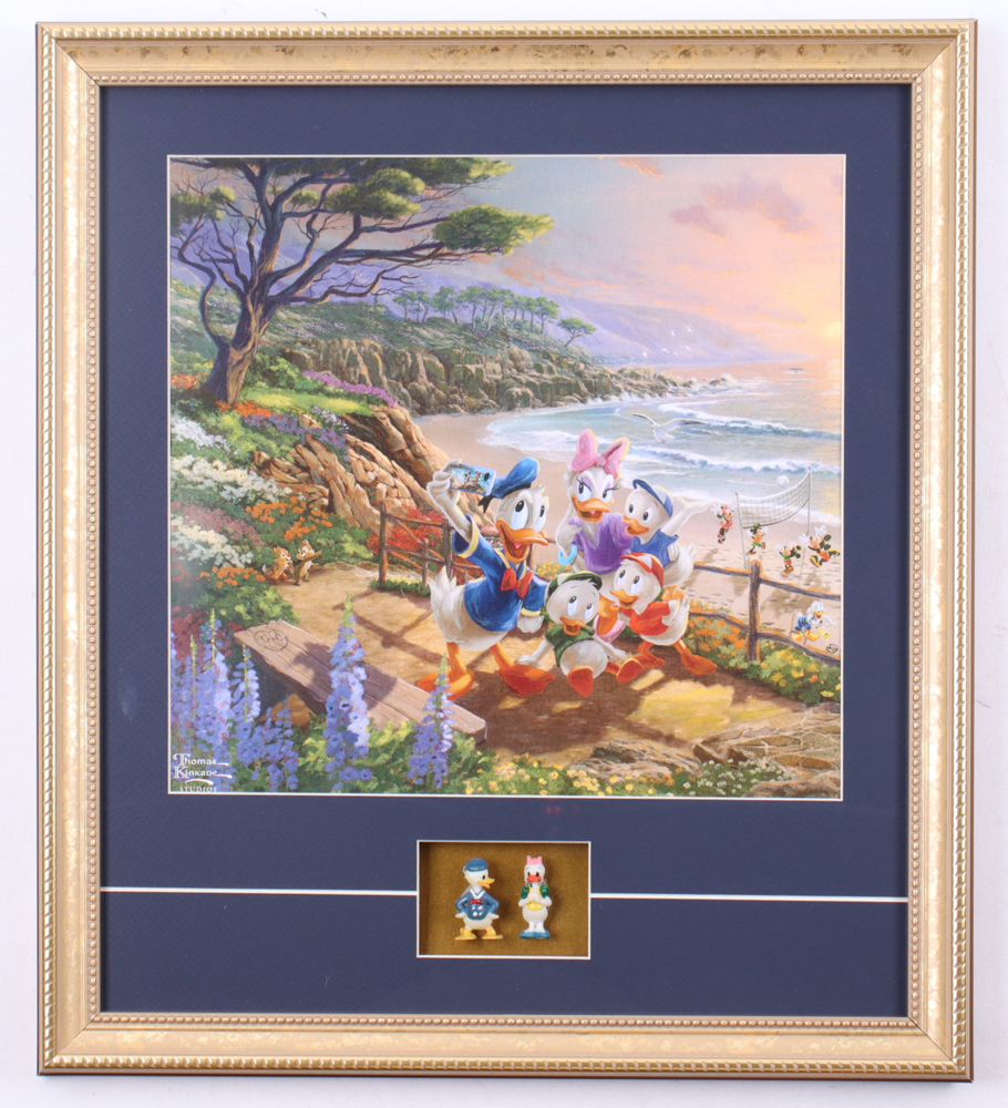 Custom frame measures approximately 16" x 18" in size and features a print of "Donald Duck & Daisy" by Thomas Kinkade (D. 2012). The display also includes (2) Vintage Character Figurines. Please note, the display is unsigned.