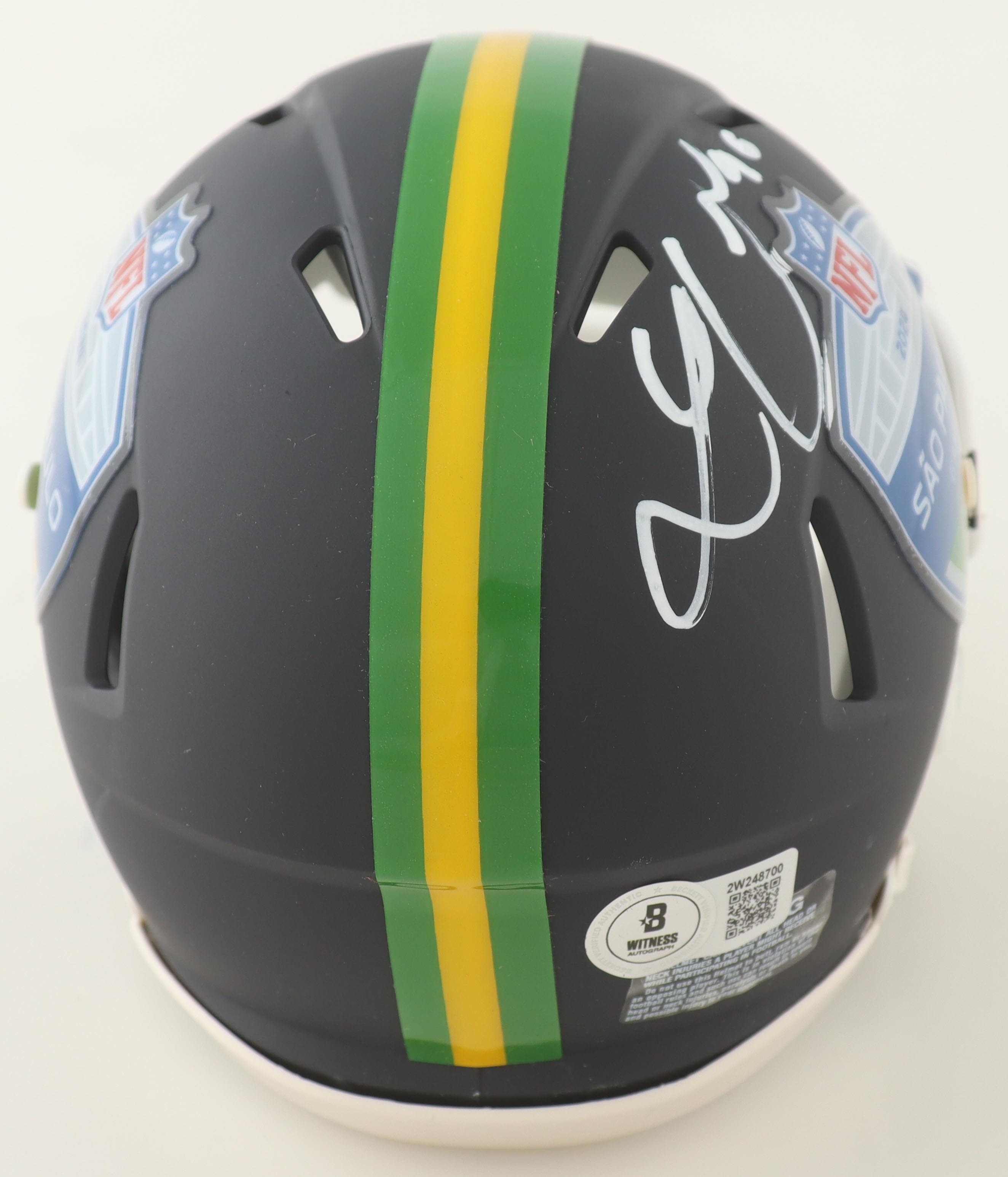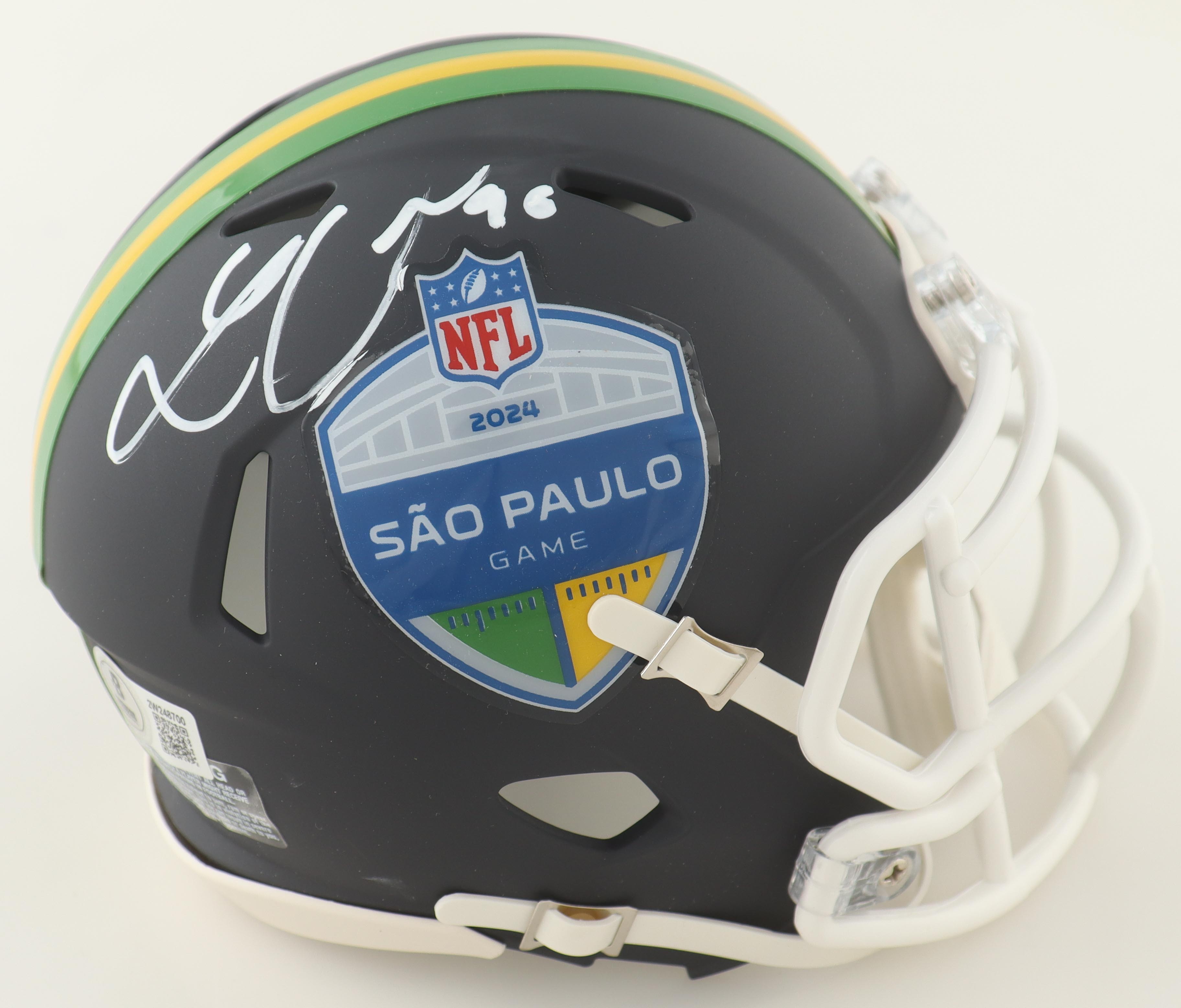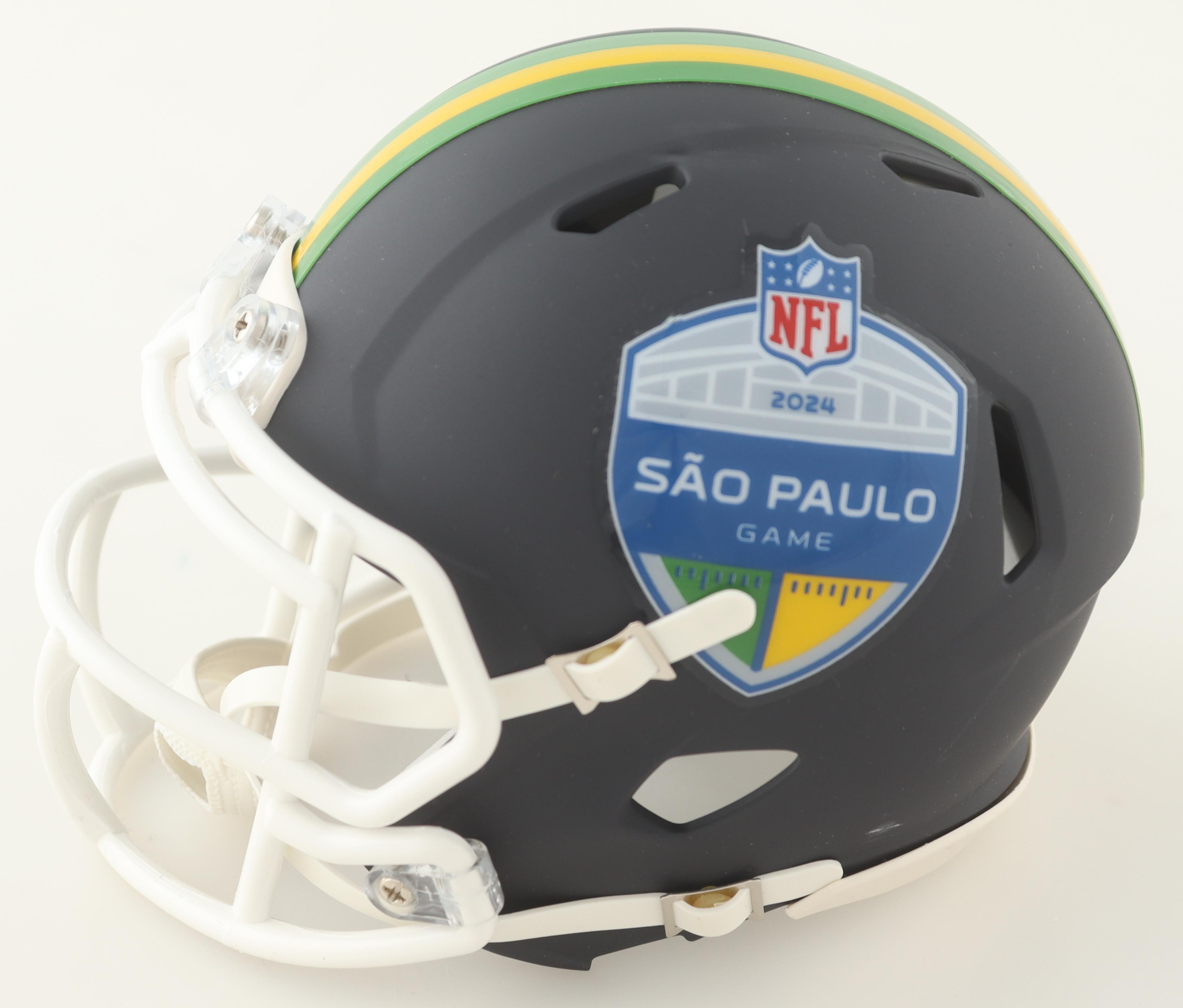 Riddell Green Bay Packers 2024 Sao Paolo Game Logo speed mini helmet. Hand-signed by Lukas Van Ness.
