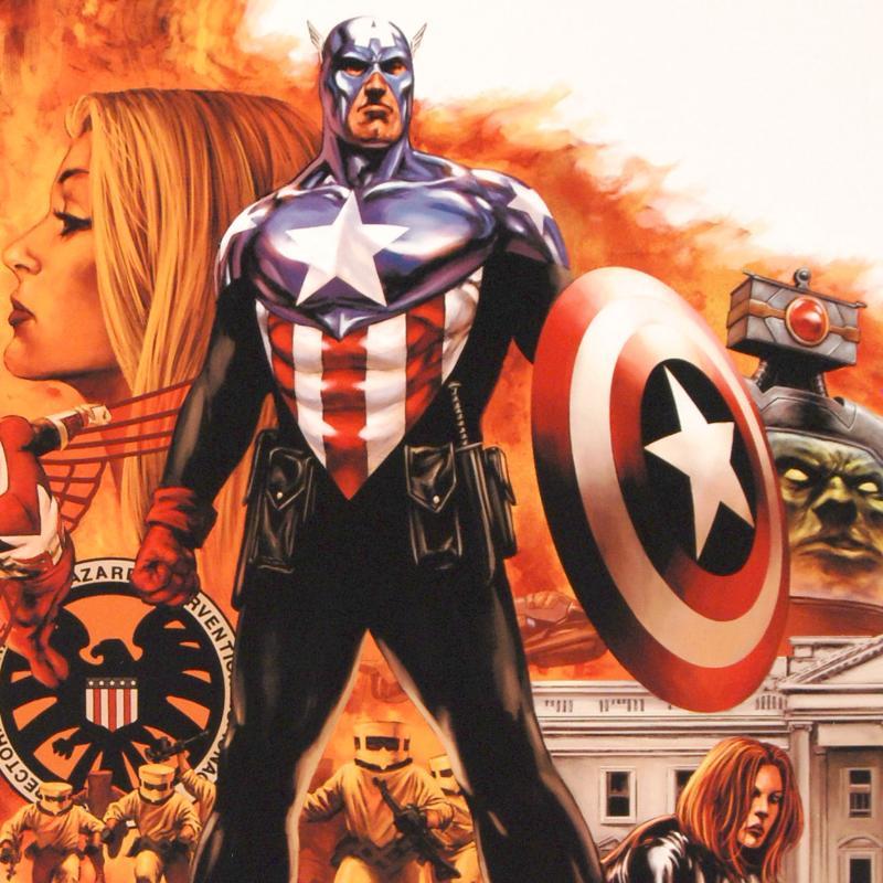A piece of comic book history, this limited edition, from original art by Steve Epting, depicts a compilation scene starring Captain America. Steve Epting began working with Marvel Comics in the early 1990s; his first assignment was a six part Avengers series, thereafter he became a full time penciler on the Avengers. More recently Epting has been working on the Fantastic Four as well as Captain America. "Captain America #41" is a limited edition giclee on canvas by Steve Epting presented by Marvel Comics, hand signed by the great Stan Lee and numbered out of only 10! This piece has been custom framed and is ready to hang! Measure approx. 25" x 34" (with frame); Includes Certificate of Authenticity! Measures approx. 18" x 27" (image).