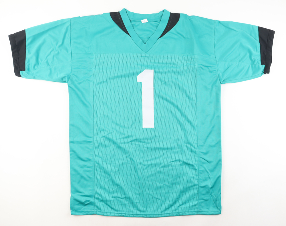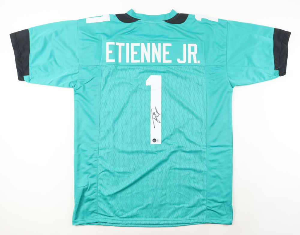 Custom jersey with everything sewn on, size XL. Hand-signed by Travis Etienne Jr.