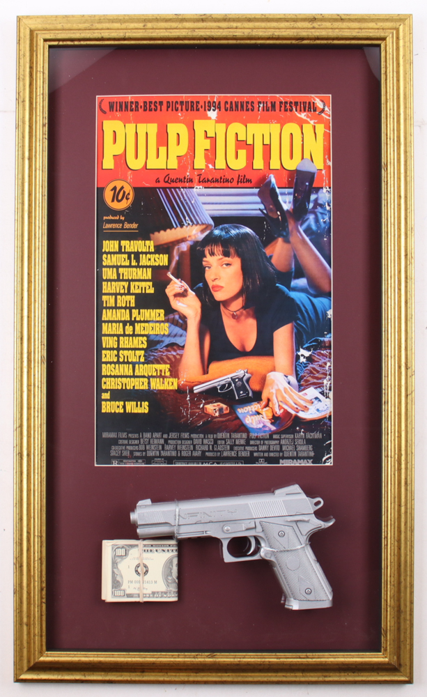 Custom frame measures approximately 18" x 30" in size and features a Pulp Fiction Movie Poster, as well as Prop Replica Money and a Replica Prop Pistol. Please note, display is unsigned.