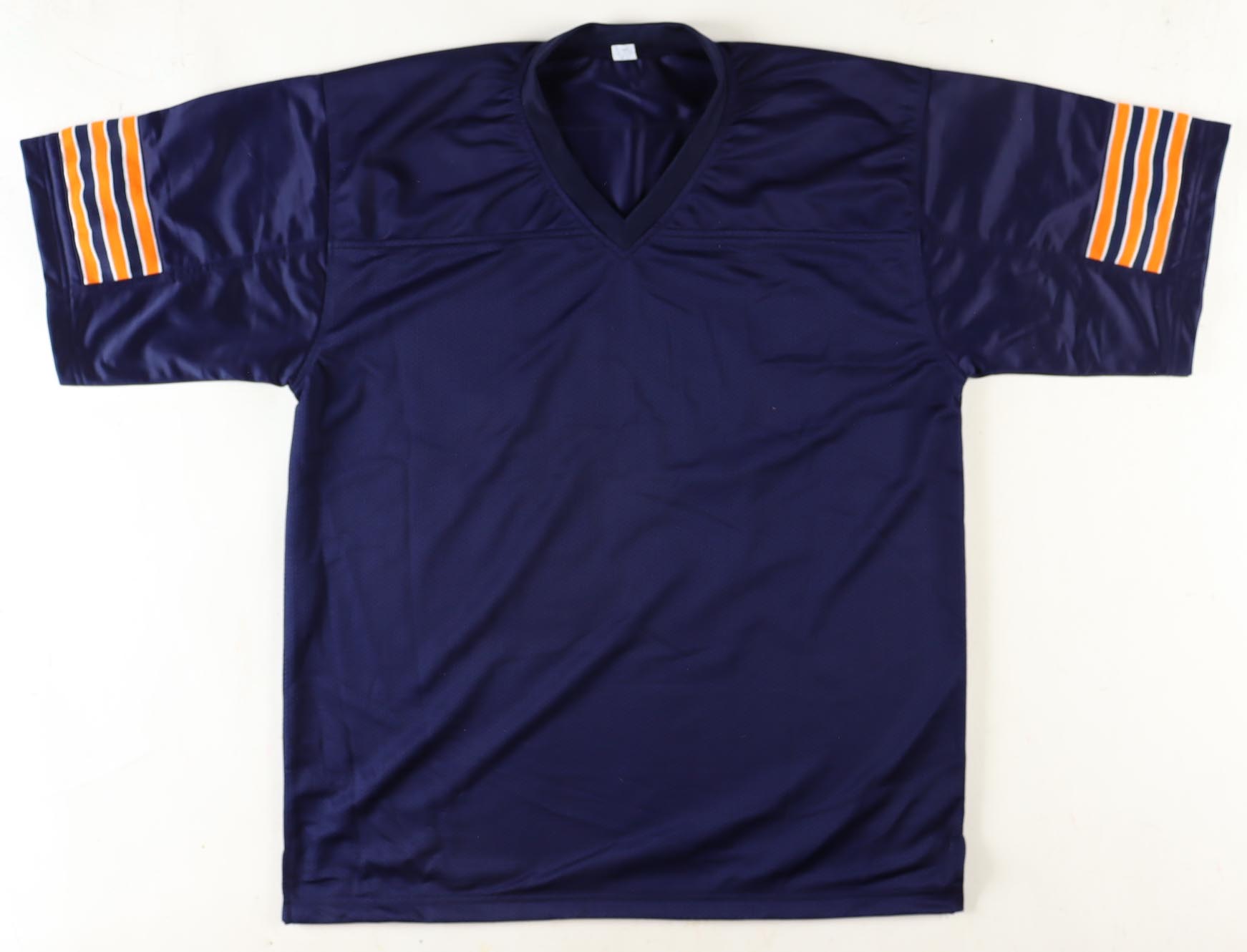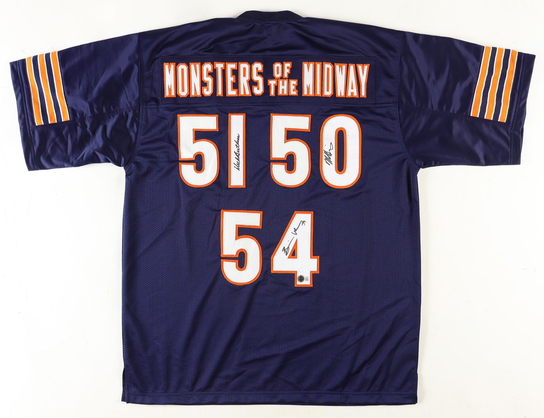 Custom jersey. Everything is sewn on, size XL. Has been hand-signed by Brian Urlacher (HOF), Dick Butkus (HOF) and Mike Singletary (HOF).