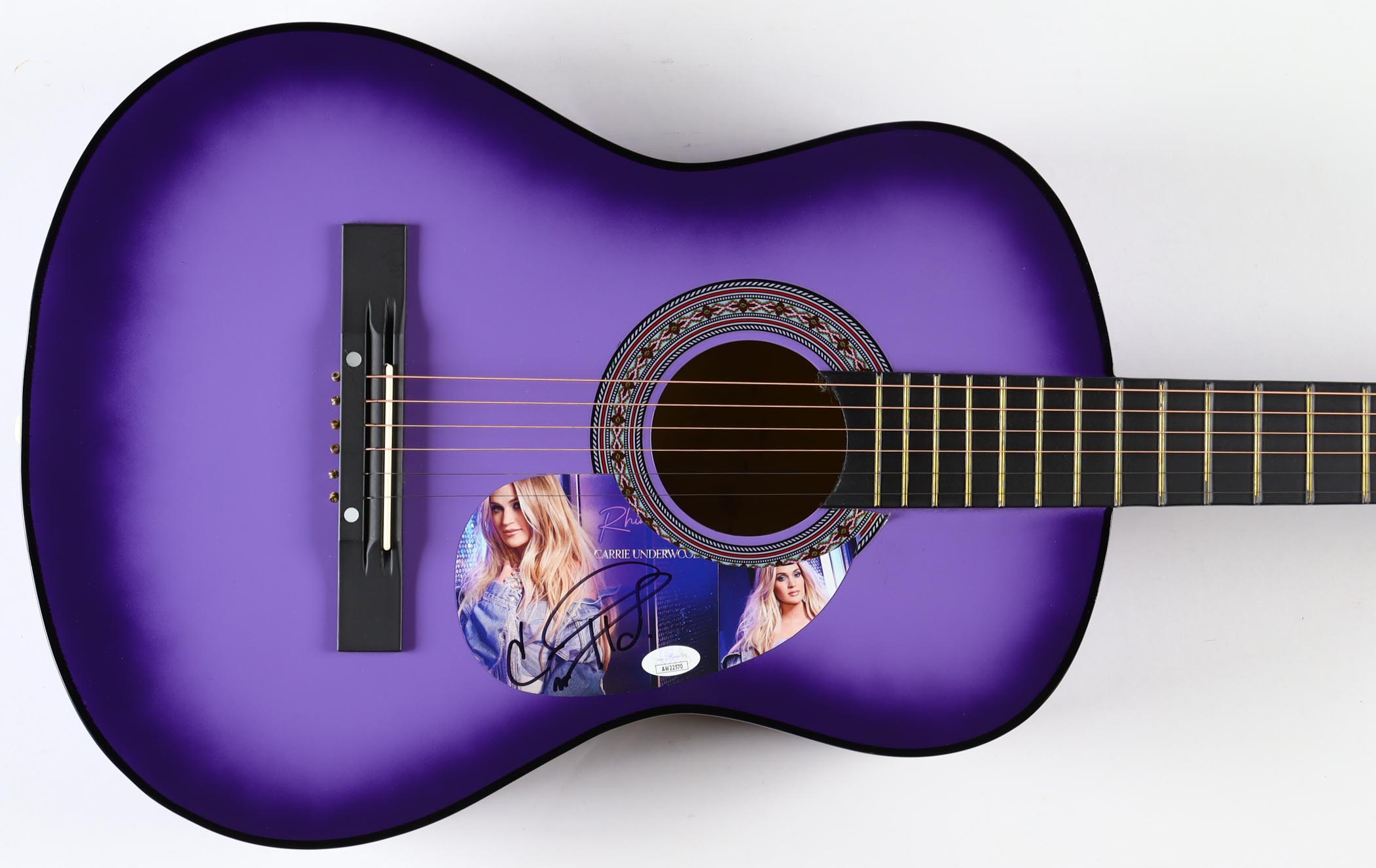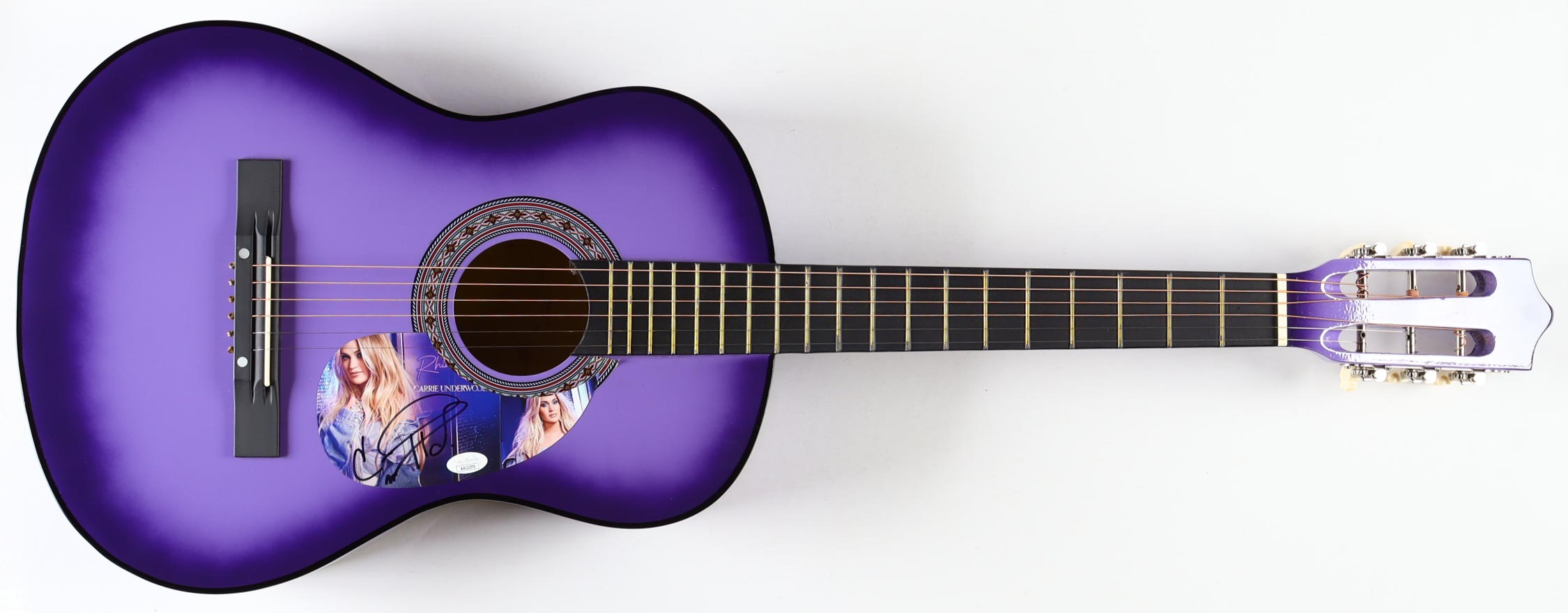Acoustic guitar measures approximately 38" in length and has been hand-signed on a cut that has been repurposed as the pick-guard by Carrie Underwood.