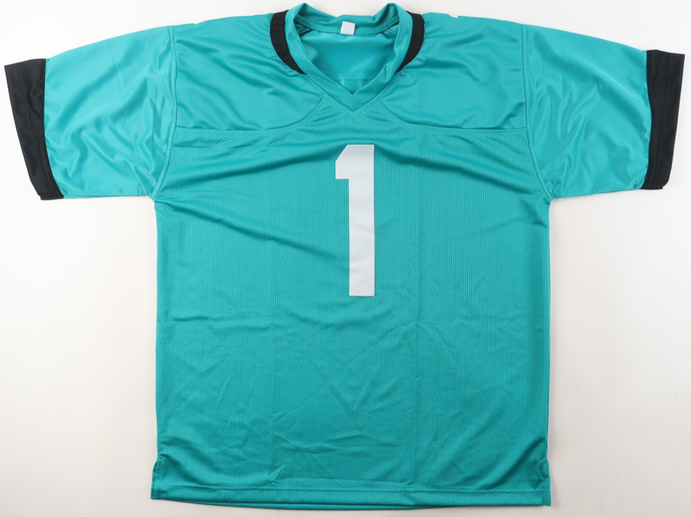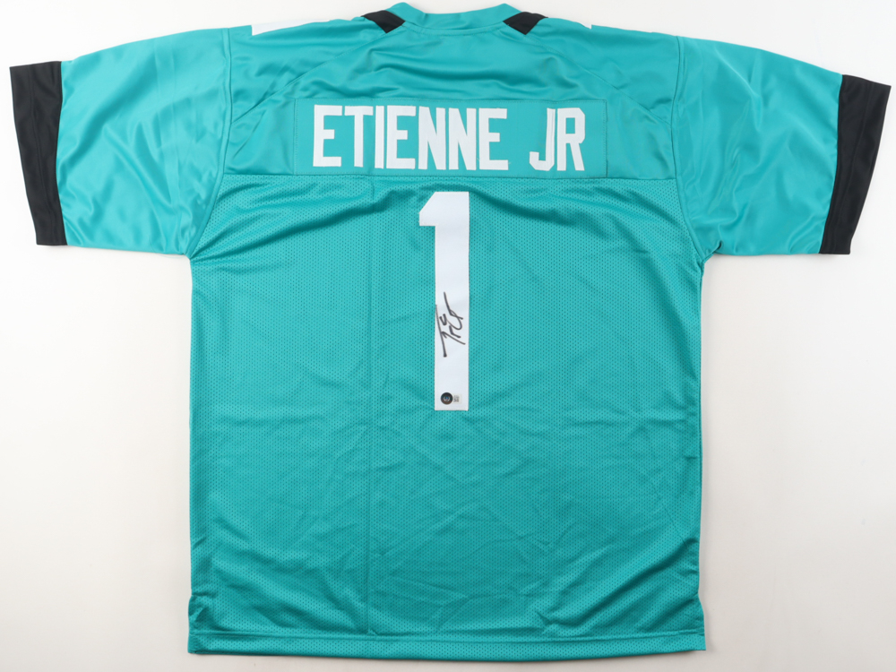 Custom jersey with everything sewn on, size XL. Hand-signed by Travis Etienne Jr.