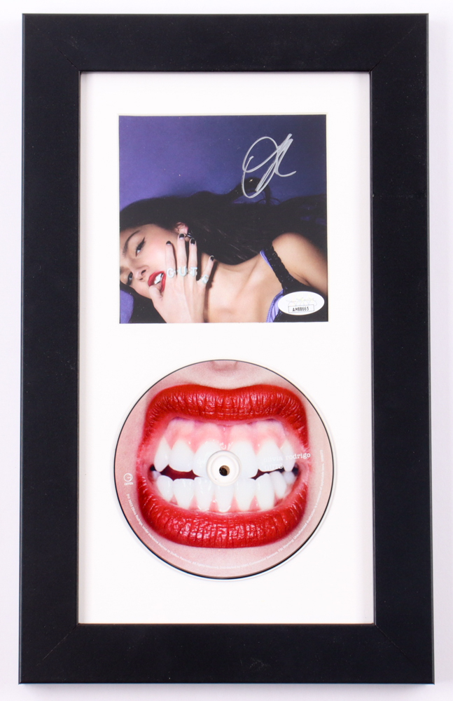 Custom frame measures approximately 8" x 13.5" in size. Features a "Guts" CD album insert that has been hand-signed by Olivia Rodrigo. The disc is included as shown.