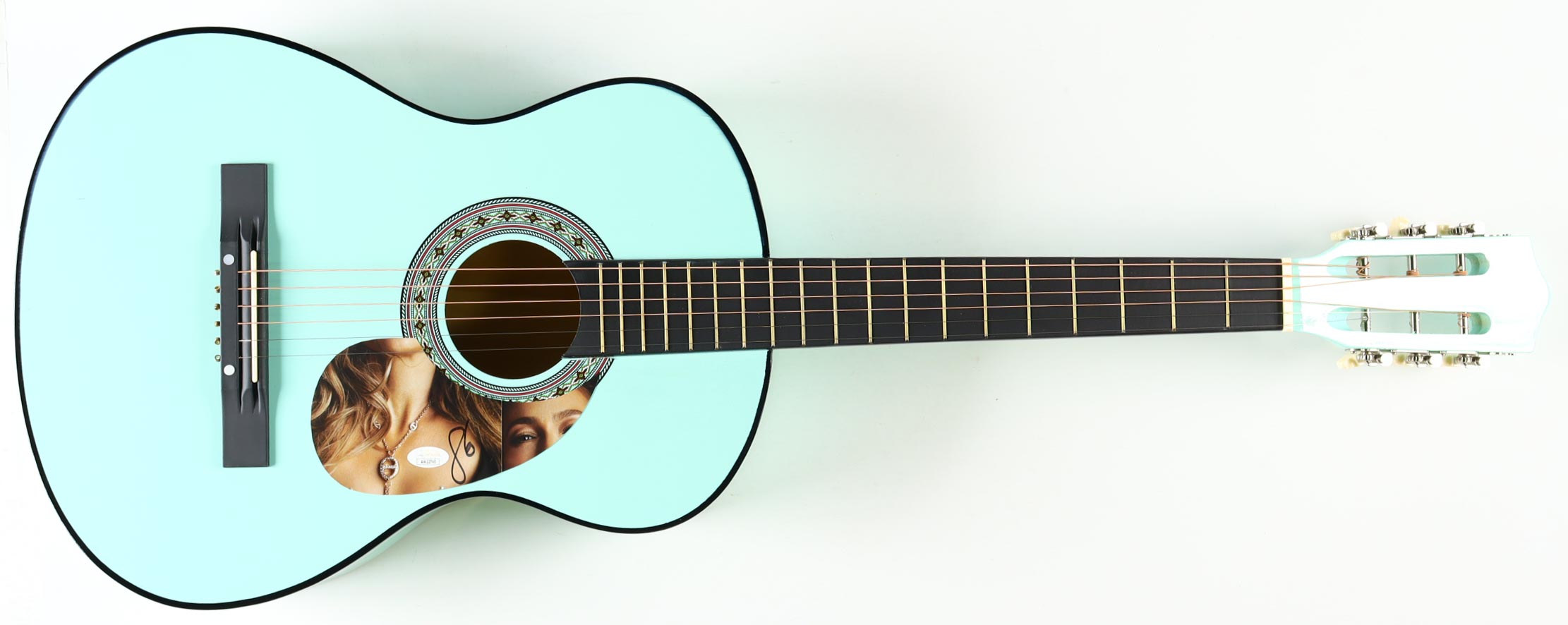 Acoustic guitar measures approximately 38" in length and has been hand-signed on a cut that has been repurposed as the pick-guard by Jennifer Lopez.