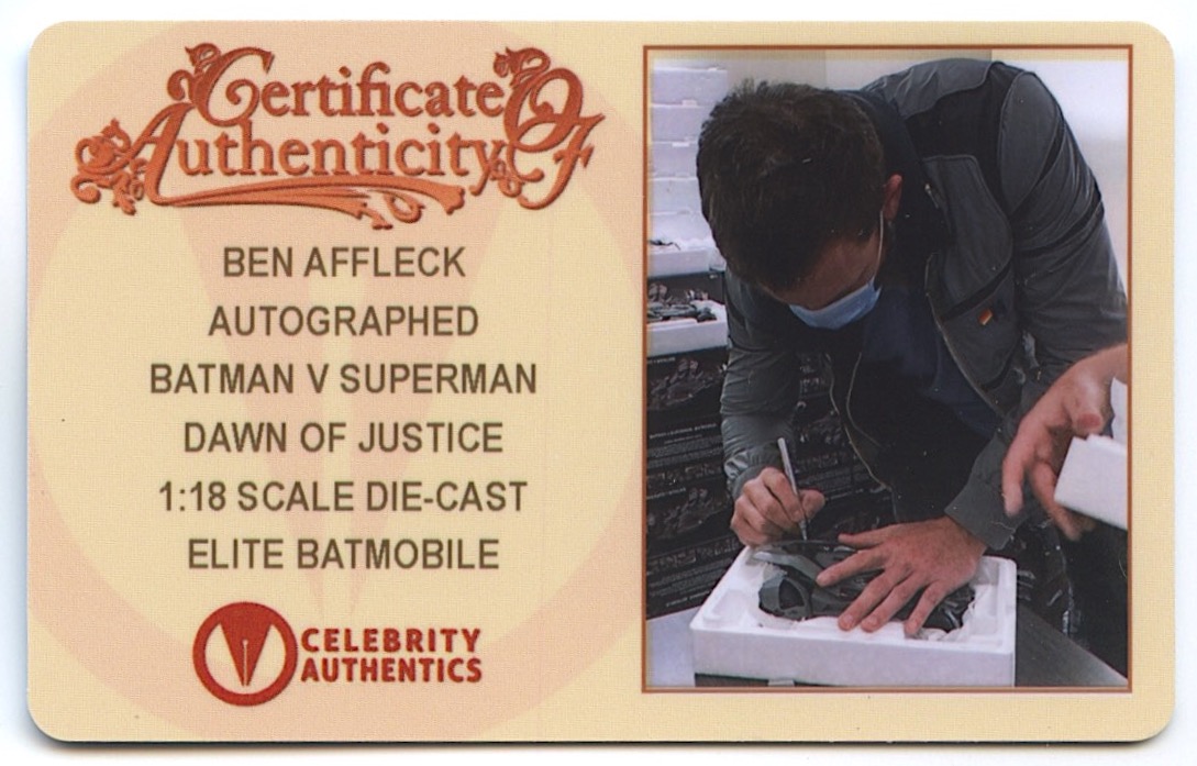 Ships affixed with Celebrity Authentics serial-numbered and tamper evident Authentication Hologram and includes Celebrity Authentics Certificate of Authenticity featuring picture of Ben signing Batmobile.